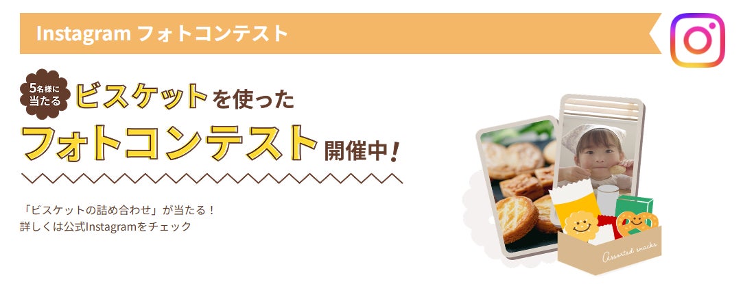 「お菓子と、わたし」公式Instagramでは、昨年に続き、ビスケットをテーマにしたフォトコンテストを実施いたします。指定のハッシュタグを付けて、ビスケットの写真やアレンジレシピを投稿いただいた方の中から、抽選で5名様にエントリービスケット32品の詰め合わせをプレゼントいたします。