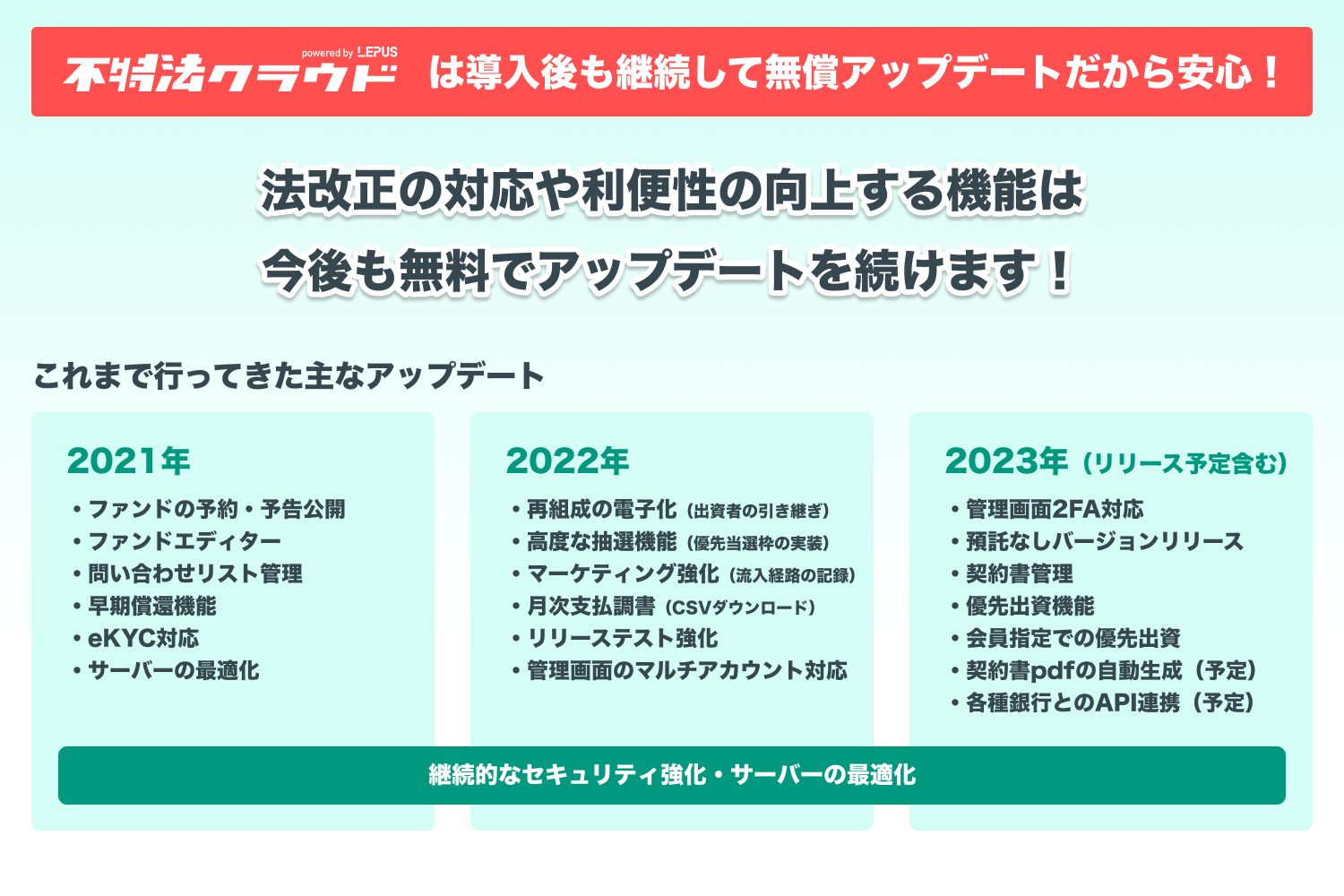 会員を限定した優先出資機能や、一括型だけでなく分割型ファンドでの早期償還ができるようになりました。