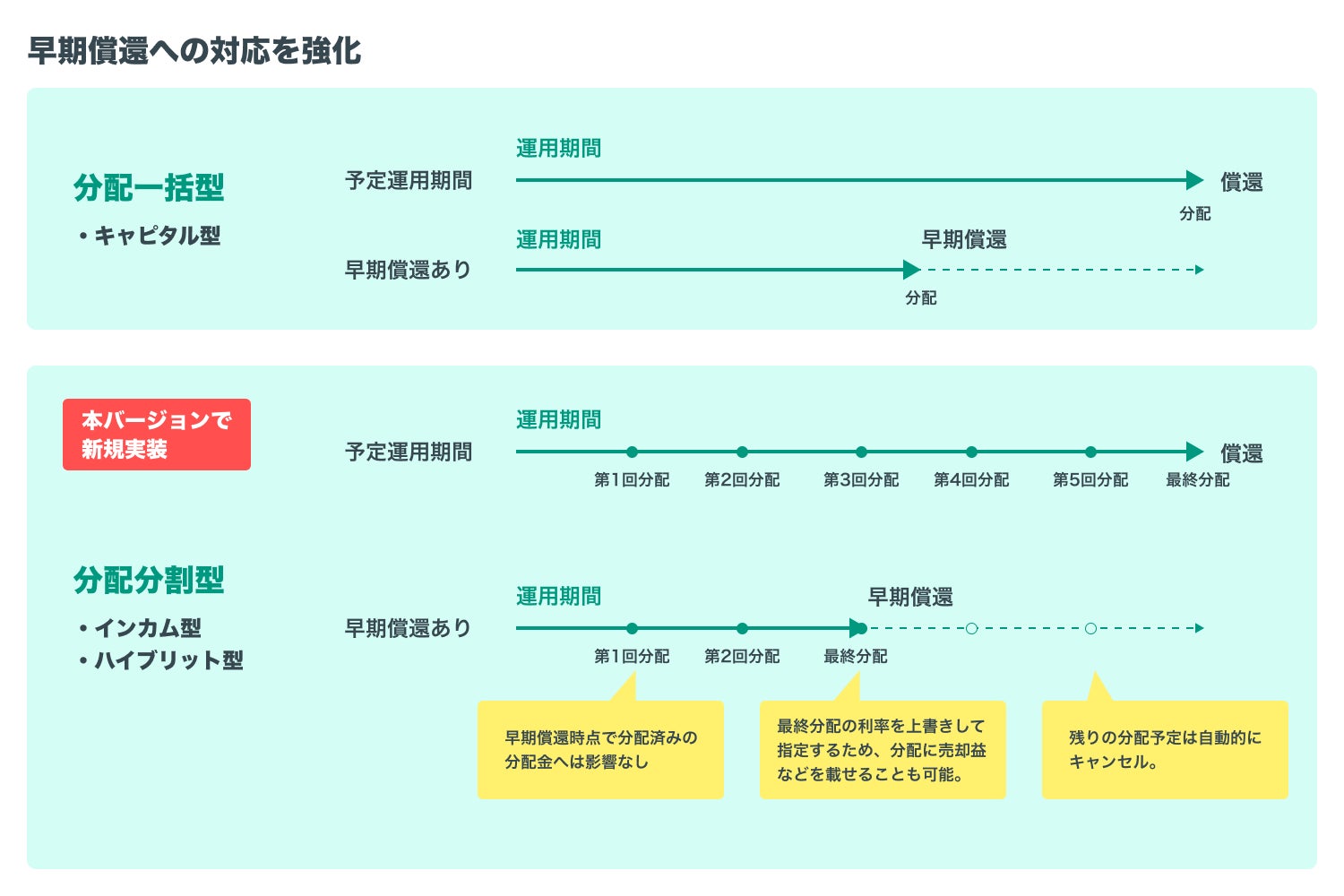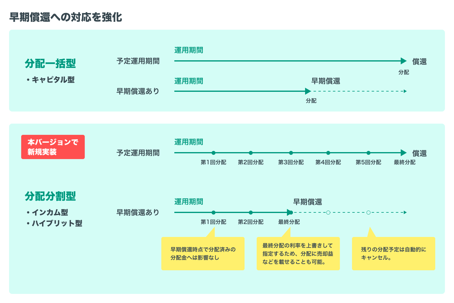 これまで分配が一括型のファンドのみ早期償還が行えましたが、 分割型のファンドでも早期償還ができるようになりました。