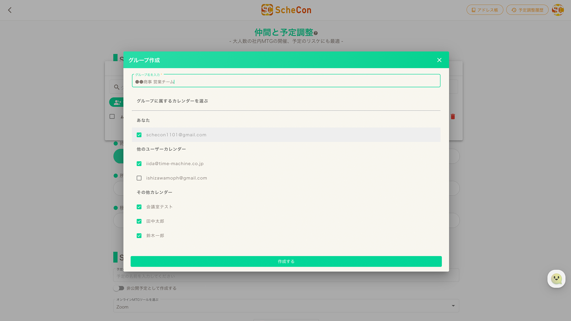 TOPページから「仲間と予定調整」を選択。頻繁に予定調整するメンバーのカレンダーにチェックを入れ(事前にカレンダーの登録が必要)グループを作成。