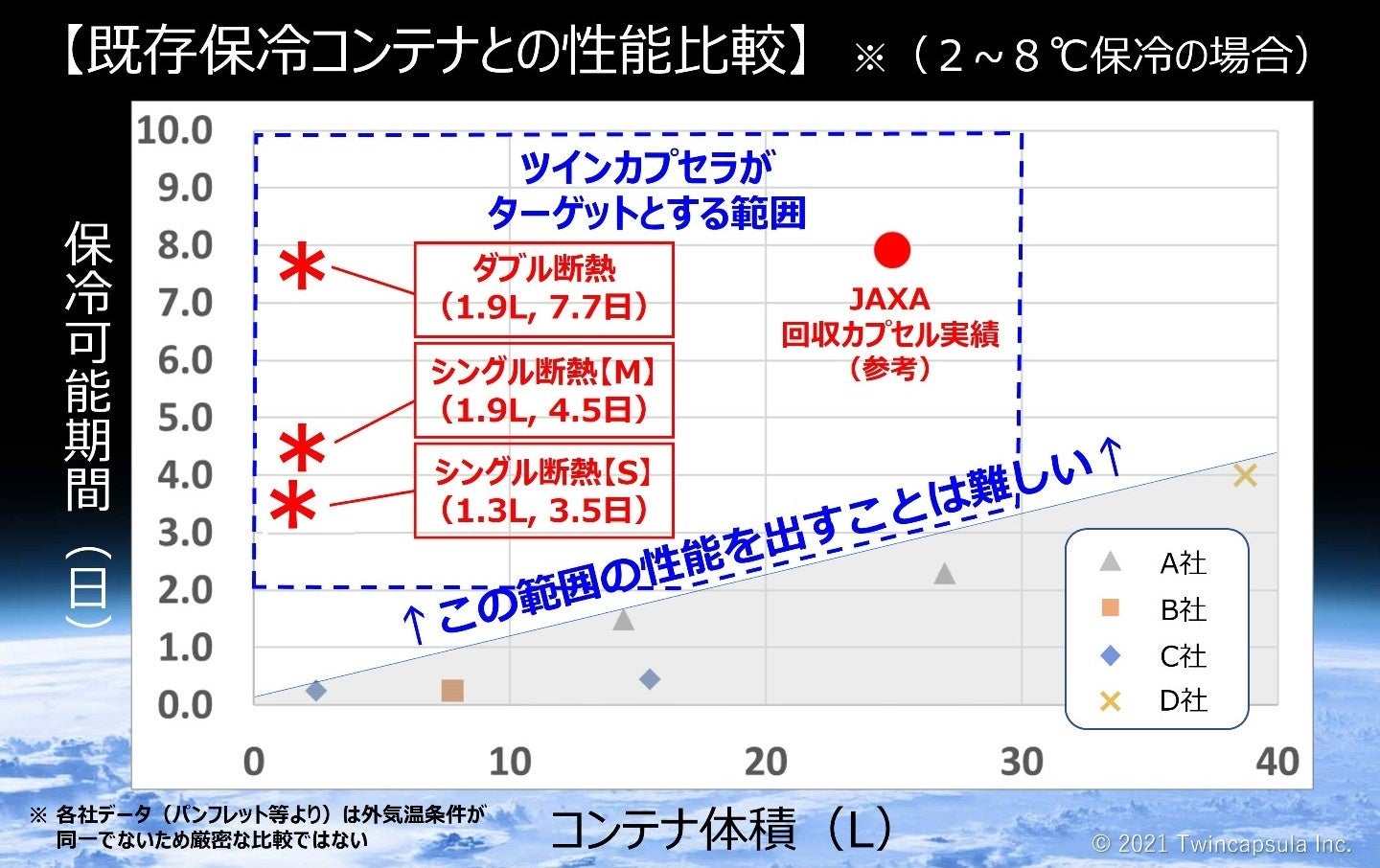 ツインカプセラは、「再突入カプセルの“超”断熱保冷技術を 地上へ 社会へ」をスローガンに掲げ、JAXAのHTV搭載小型回収カプセル(※)の断熱保冷容器技術の社会実装を目指すJAXAベンチャーです。小型・超高性能の保冷コンテナの開発・供給により、検体、ワクチン、細胞、医薬品、生体組織等の個別化保冷輸送を可能とし、臨床研究における検体収集、癌等の早期スクリーニング、分散型臨床試験(DCT)、自家細胞の国際往復輸送等、バイオメディカル分野の保冷輸送において、新たなサービスの創出を目指しています。2021年10月から、タイガー魔法瓶株式会社と”超”断熱保冷容器事業に関する業務提携、2024年8月より、株式会社Cooridinate Labと治験・臨床研究の血液検体収集等におけるスリム型”超”断熱保冷容器の活用に関する業務提携を行い、製品開発・事業開発を進めている。