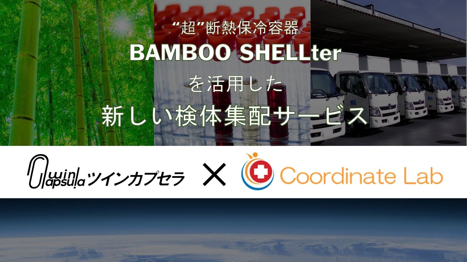 今回、スタートすることとなったワンストップの検体集配サービスでは、ツインカプセラの”超”断熱保冷容器「BAMBOO SHELLter」を使用し、また、検査業界で豊富な経験と実績を有するCoordinate Labが医療機関や輸送事業者との調整を担うことで、両社の強みの相乗効果により「検体の品質の確保(確実かつ安定した温度維持)」「検体集配のコストの削減」「検体集配における手間の削減」という価値を利用者に提供いたします。