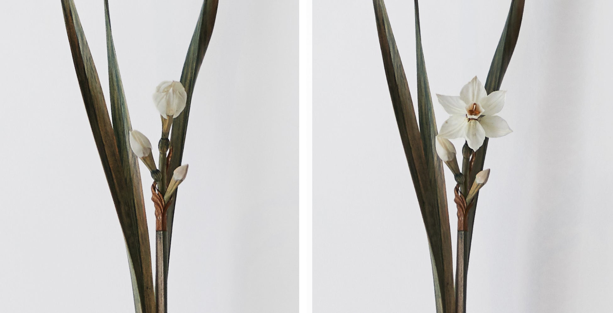 フィンランドの森を描き続ける佐藤裕一郎。彼の鉛筆画は”乾式の水墨画”とも呼ばれています。今回は佐藤の新作と共に、2022年に描いた8mの大作を立体的に展示致します。また彫刻家の大竹亮峯は新作の竹の水仙を披露致します。この水仙は彫刻物でありながら、水を注ぐと蕾が花開く驚きの作品です。KANEGAEの離れにて、二人のインスタレーション作品をご堪能ください。
