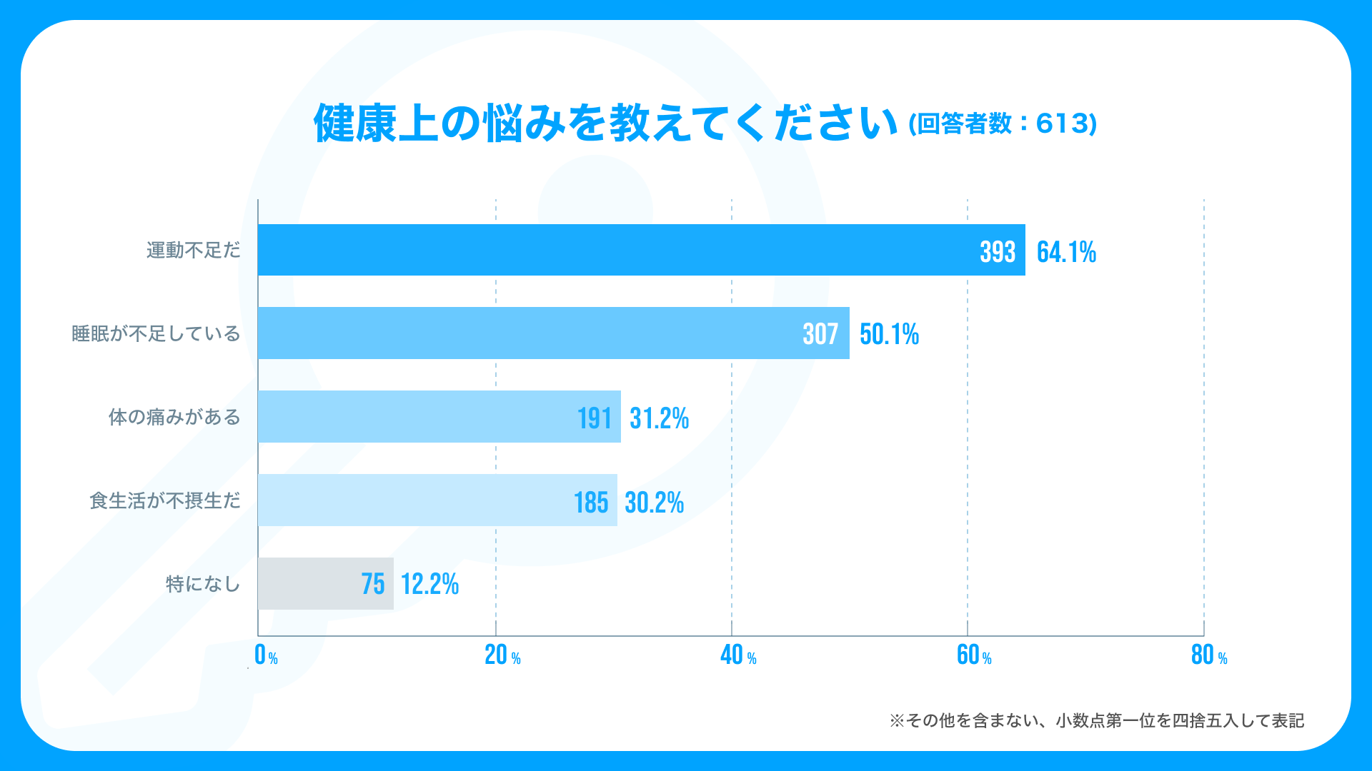 調査項目は異なりますが、似たような東京都の調査では健康上の懸念を感じている人が約2割という結果が出ており※1、実に2倍以上の割合で健康を心配しているようです。