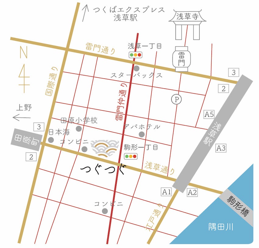 銀座線浅草駅から徒歩5分、浅草線浅草駅から徒歩3-4分、田原町駅から徒歩3分、つくばエクスプレス浅草駅からも徒歩圏内です。