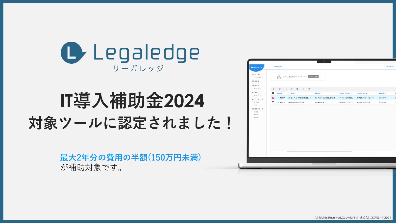 契約業務DX化サービス「リーガレッジ」を提供する、株式会社コスモルート(本社:東京都港区 代表取締役社長:島本 鉄弥)は、この度、経済産業省の「IT導入補助金2024」対象ツールに認定されました。