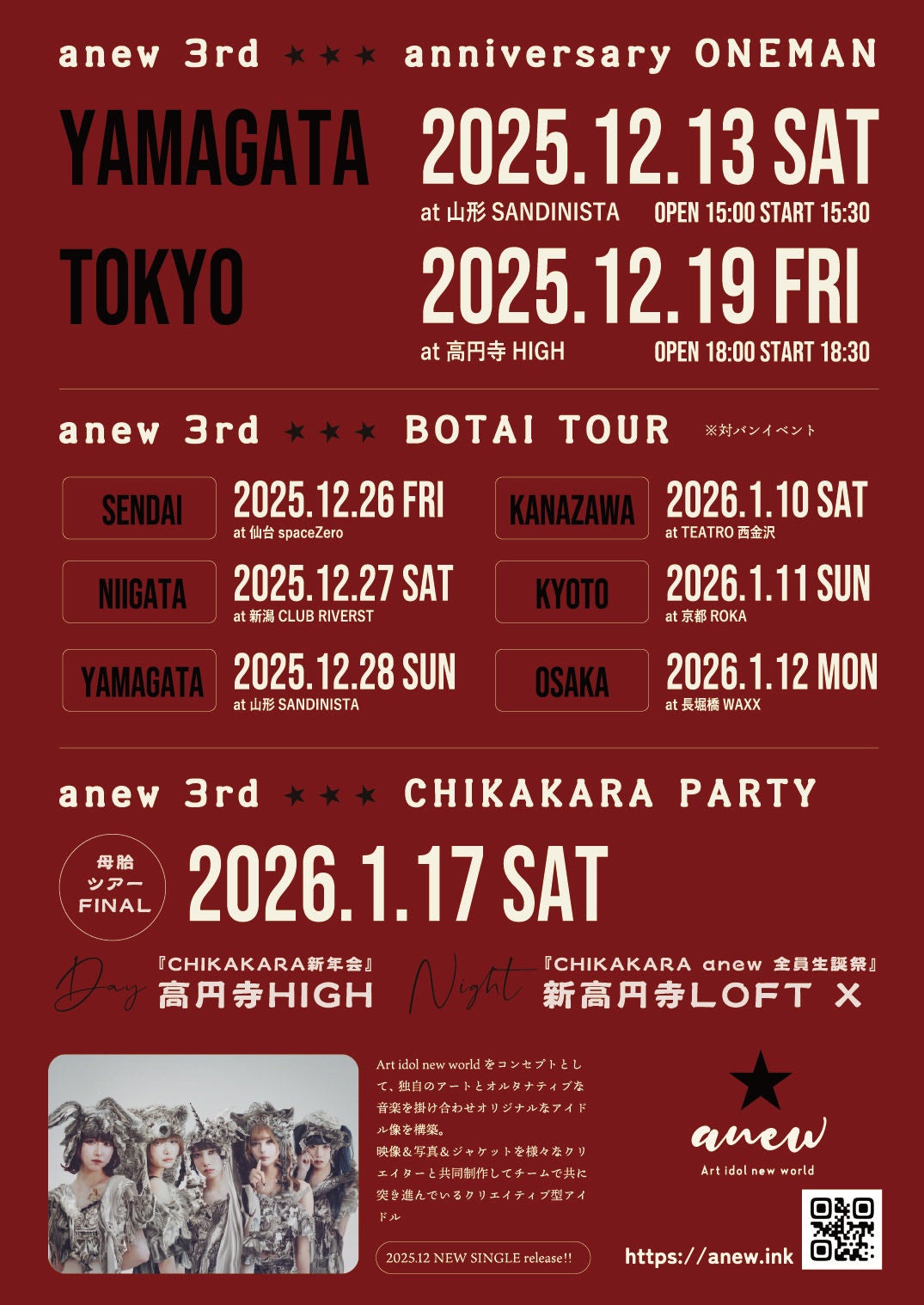 2025年12月13日には山形・SANDINISTAにて、19日には東京・高円寺HIGHにて3周年記念ワンマンライブ「anew 3rd anniversary oneman ~母胎~」を開催する。