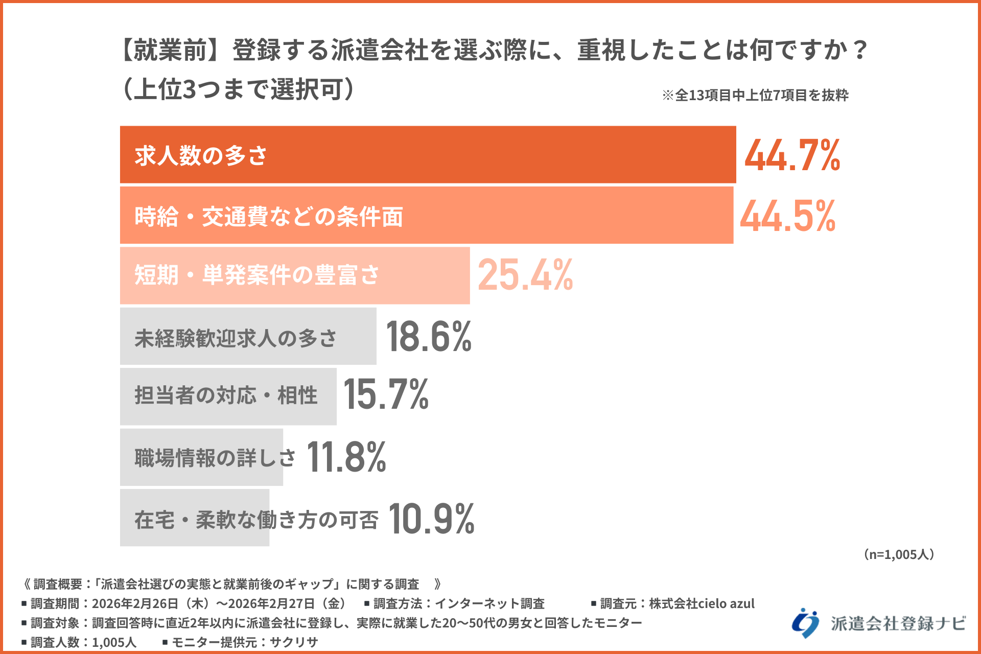 就業前、登録する派遣会社を選ぶ際に重視したことでは「求人数」が最多でしたが、最終決定の段階では時給や交通費といった直接的な「条件面」がわずかに上回る結果となりました。