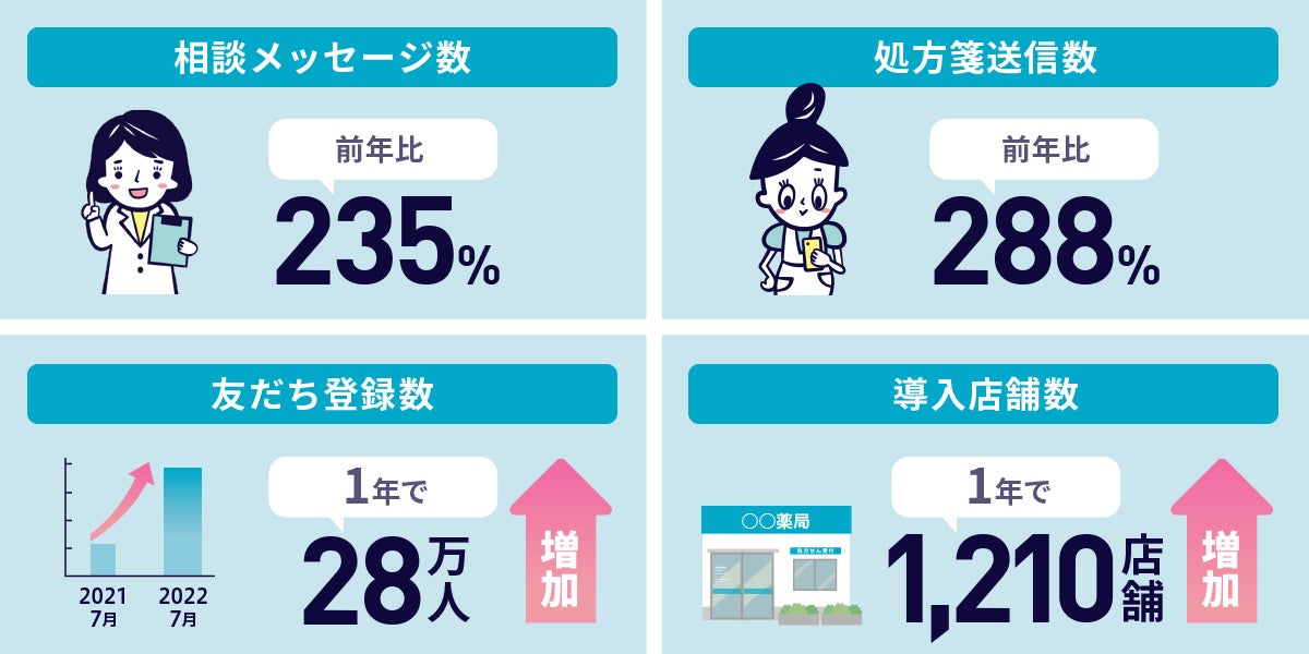サービスの中では、お薬の事で不安があった時、気軽に薬剤師へチャットで相談できる「健康・お薬相談機能」の利用が前年比235%、薬局での待ち時間削減に使える「処方箋送信機能」前年比288%など、多くの方に利用されており、また、普段から使い慣れたLINEという点もあり、幅広い年齢層にご利用いただけているサービスです。