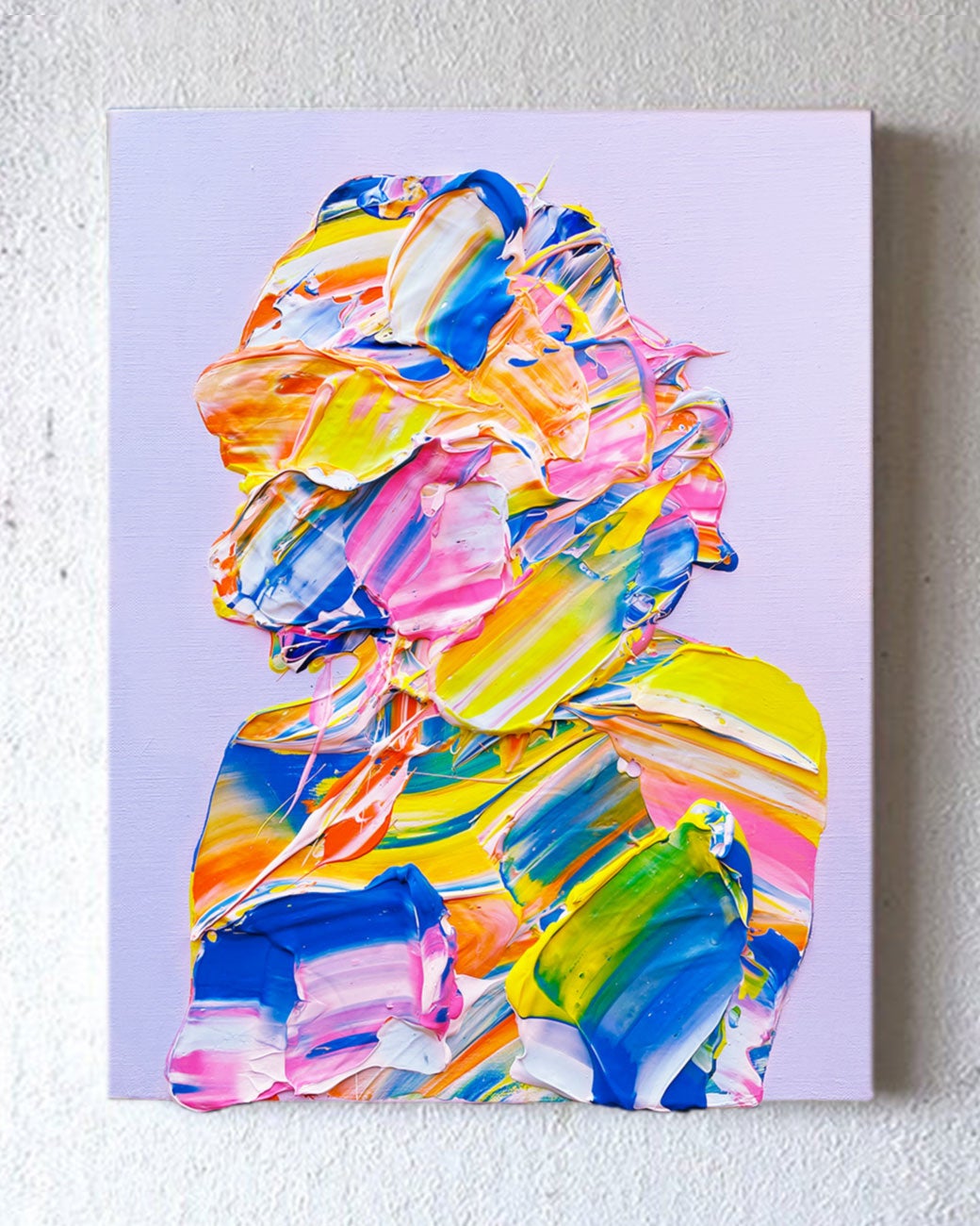 世界30カ国を放浪しながら、音楽、デザイン、映像などを制作するクリエイターとして活動後、2021年から本格的にアート制作を始める。「情報社会」というコンセプトを機軸に、ミュージシャンや俳優などの著名な人物をモチーフにした抽象画を制作。