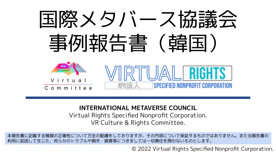 NPO法人バーチャルライツ(理事長:國武悠人)及び VR Culture & Rights Committee(代表:ソンミンウ)によって構成される「国際メタバース協議会」は10月4日、「事例報告書(韓国)」を公開いたしました。