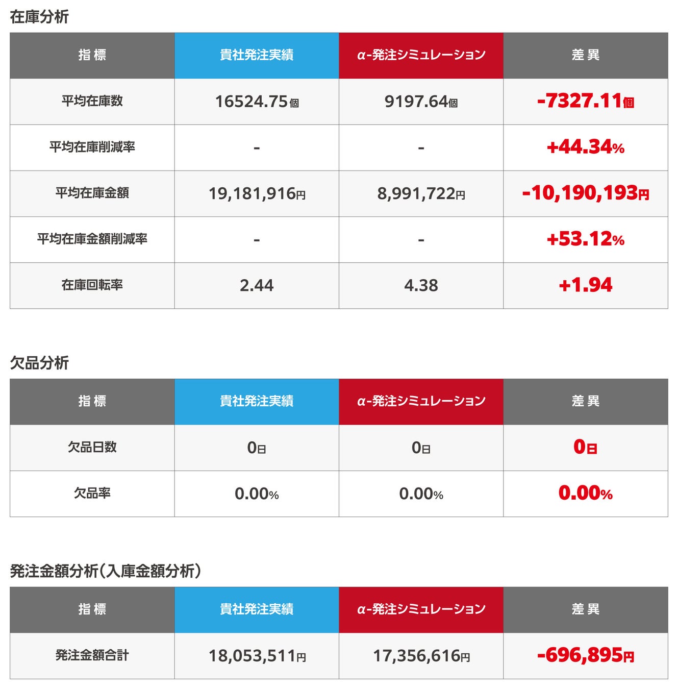 これにより、「α-発注」導入前の段階で、平均在庫数・在庫金額・在庫回転率・欠品日数といった複数の指標を、現行の発注方法とAI発注とで比較でき、実際の取引条件に即した在庫削減効果・欠品削減効果をよりリアルに検証していただけます。