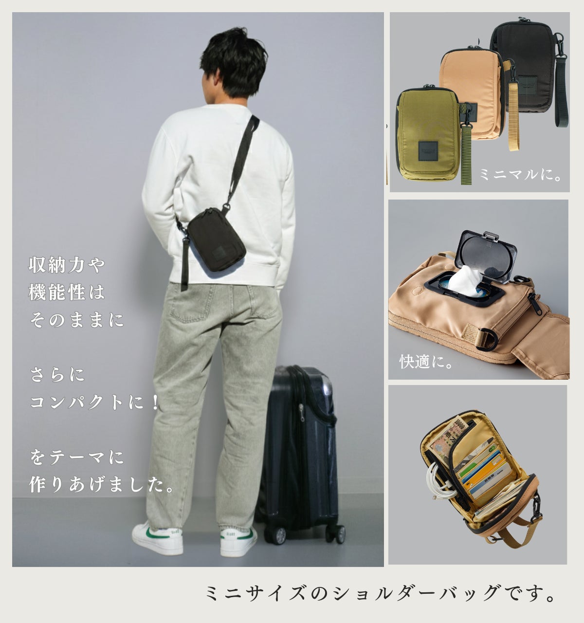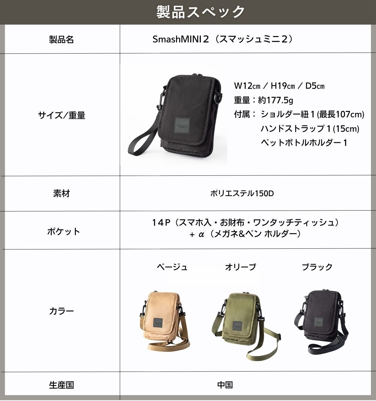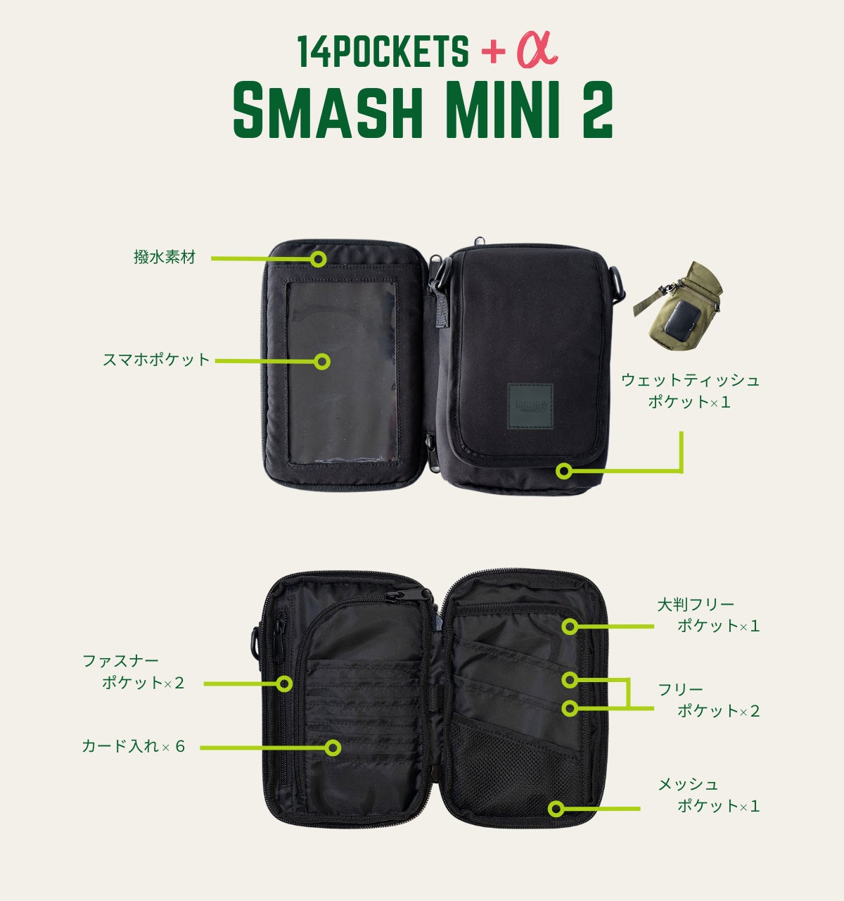 「SmashMINI2」は、子育て世代のアクティブなお出かけを快適にサポートするためのユニセックスなコンパクトショルダーバッグです。従来のSmashMINIシリーズからさらに改良され、以下の特徴を持っています。