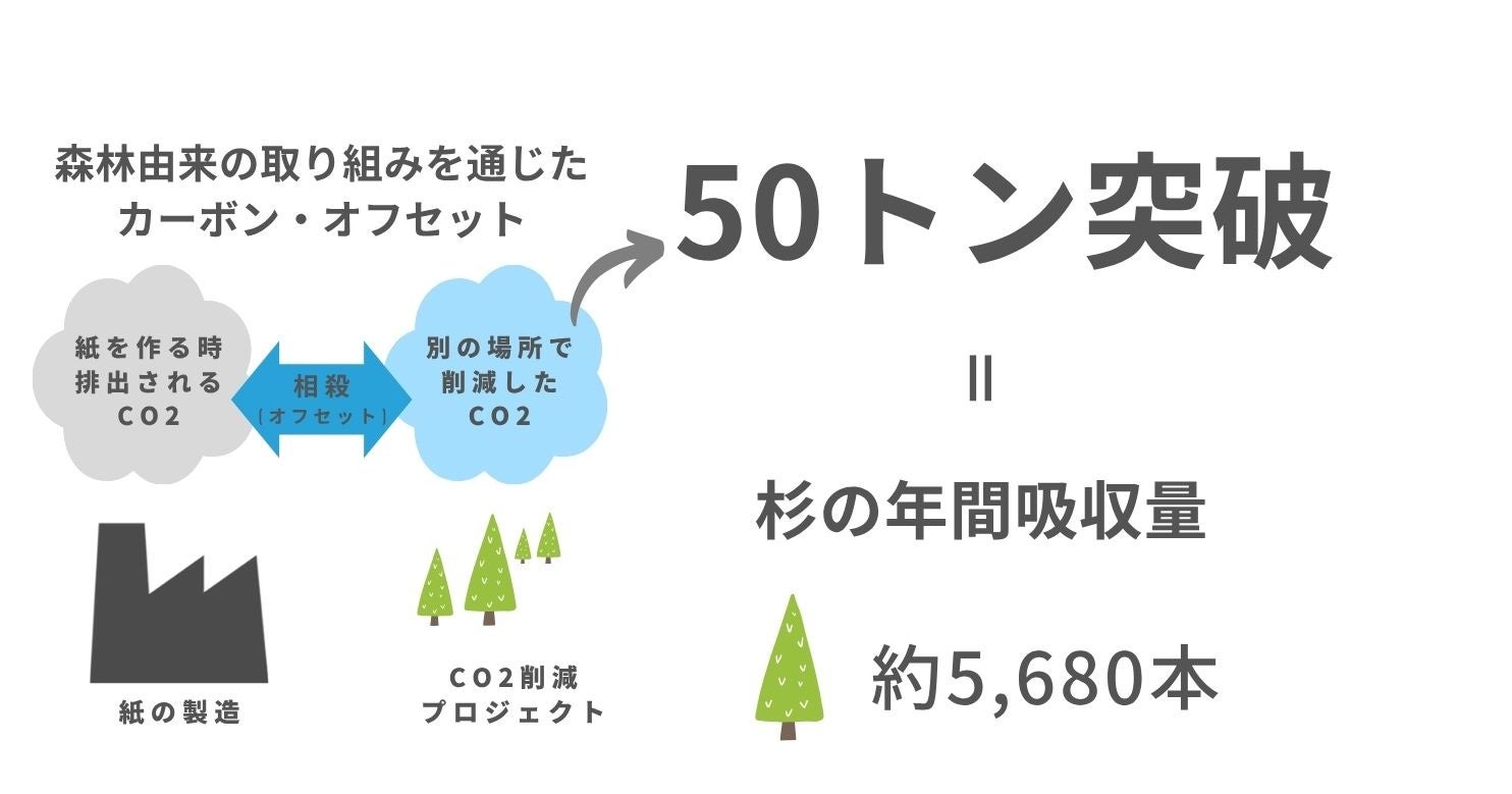 「ゼロCO2ペーパー」は、紙の製造過程で発生するCO2を、森林保全活動によって創出されたカーボンクレジットで相殺(カーボン・オフセット)し、実質ゼロにする取り組みです。2023年6月の発売以来、多くの企業様にご賛同いただき、今回、累計のCO2オフセット量が50トンを突破いたしました。これはスギの木、約5,680本が1年間に吸収する量(※)に相当します。脱炭素社会への貢献と日本の林業支援への取り組みが、着実に広がりを見せています。