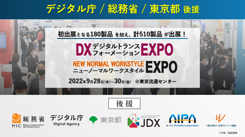 2022年9月28日(水)から30日(金)までの3日間、「第2回 DX -デジタルトランスフォーメーション- EXPO 秋」「第2回 ニューノーマルワークスタイルEXPO 秋」を開催いたします。2回目となる今回は、初出展となる180製品を加え、計510製品が出展。DX・働き方改革を実現する製品・サービスが集結するため、バックオフィス業務や営業・マーケティング部門のDX化を進めたい方必見の展示会となっています。