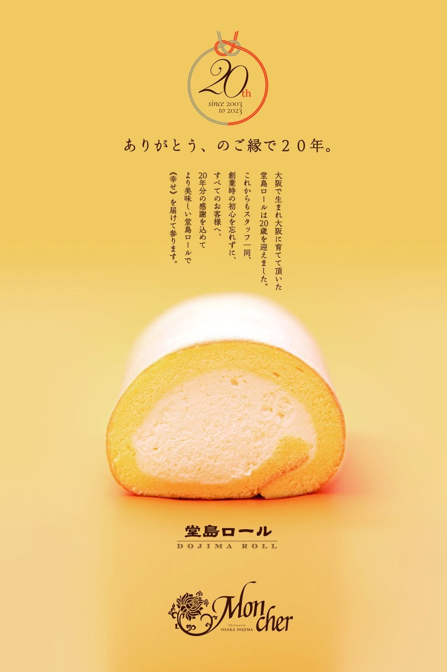 2023年11月3日で20周年を迎える(株)モンシェールは、2003年にビジネス街大阪・「堂島」の地に誕生しました。創業時、完売でご迷惑をおかけしたお客様に1本でも多くお届けしたいと、渦巻の長い生地を節約し、「ひと巻きロール」が誕生したのが「堂島ロール」の始まりです。
