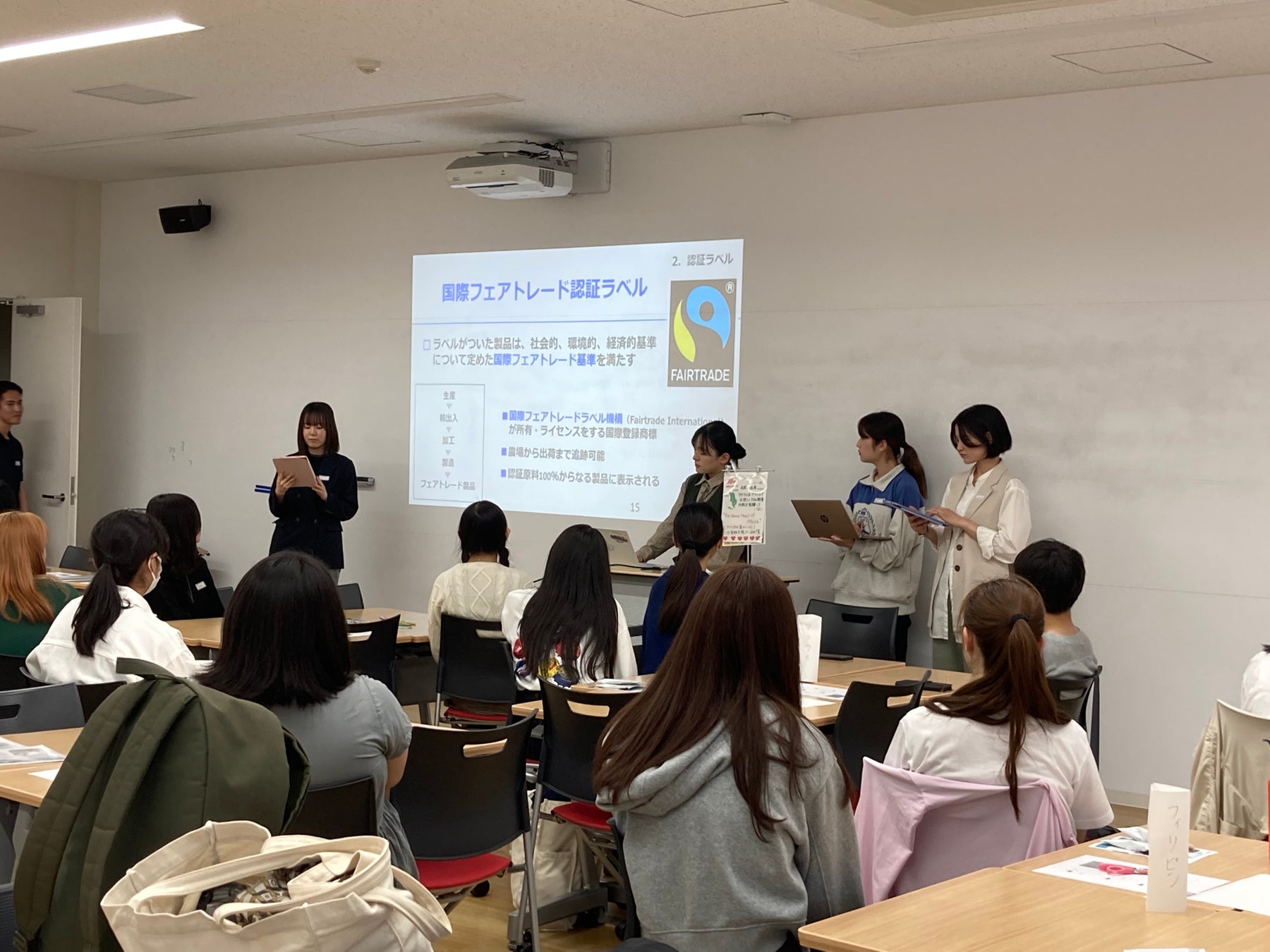 FACTによるレクチャーで、フェアトレードについて学びました。フェアトレードとは何か、という内容から始まり、使用されているマークや日本での理解度、直面している課題についてお話ししていました。