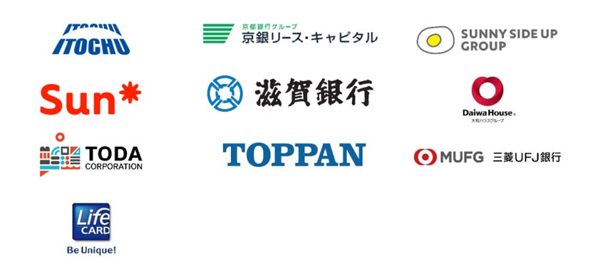 アンカー・シップ・パートナーズ株式会社、伊藤忠商事株式会社、京銀リース・キャピタル株式会社、株式会社 協和、株式会社サニーサイドアップグループ、株式会社Sun Asterisk、株式会社滋賀銀行、大和ハウス工業株式会社、戸田建設株式会社、凸版印刷株式会社、株式会社三菱UFJ銀行、ライフカード株式会社 他
