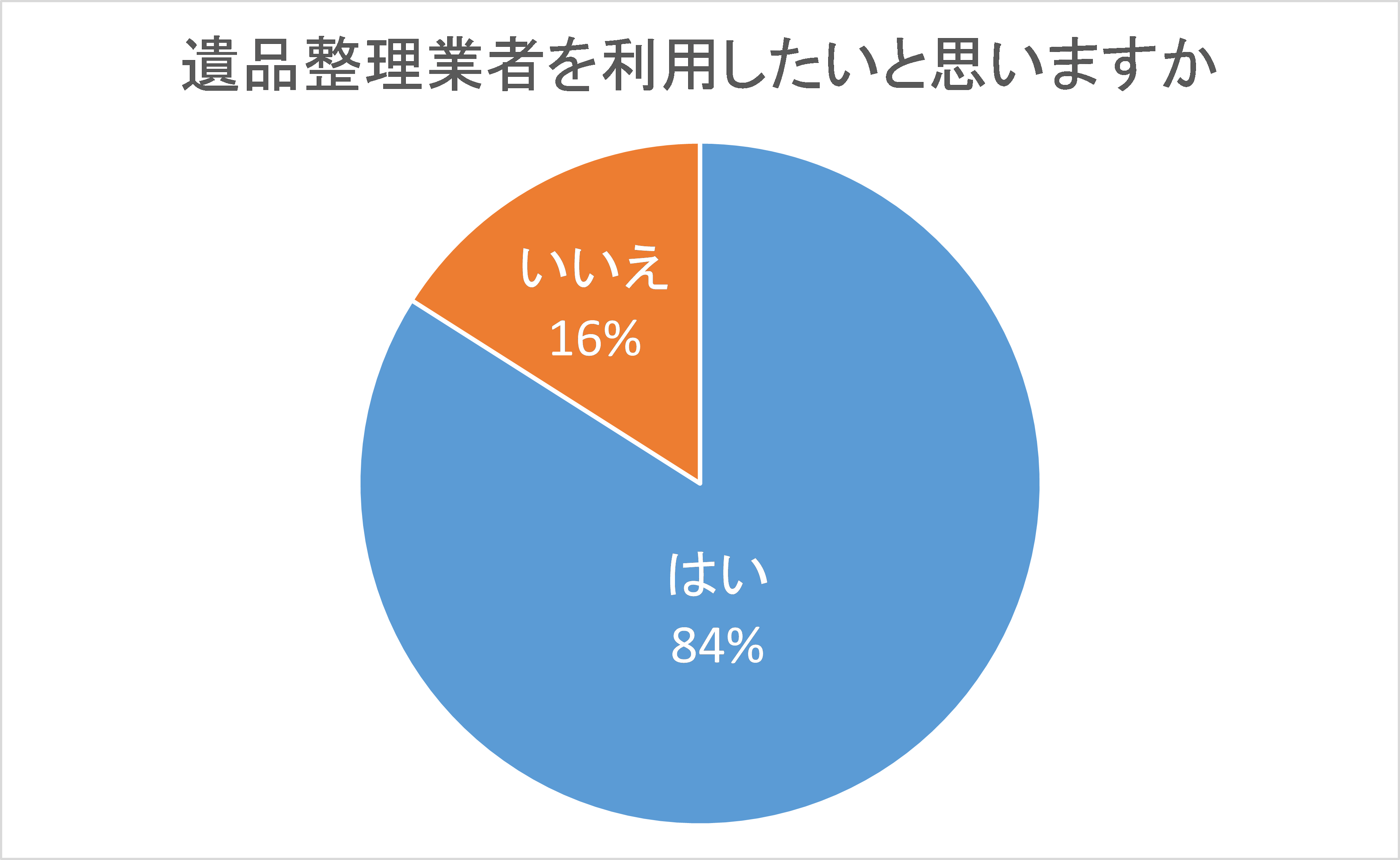 「遺品整理業者を利用したいと思いますか」という質問に対しては、84%の方が「はい」と回答し、「いいえ」と回答した方は16%でした。