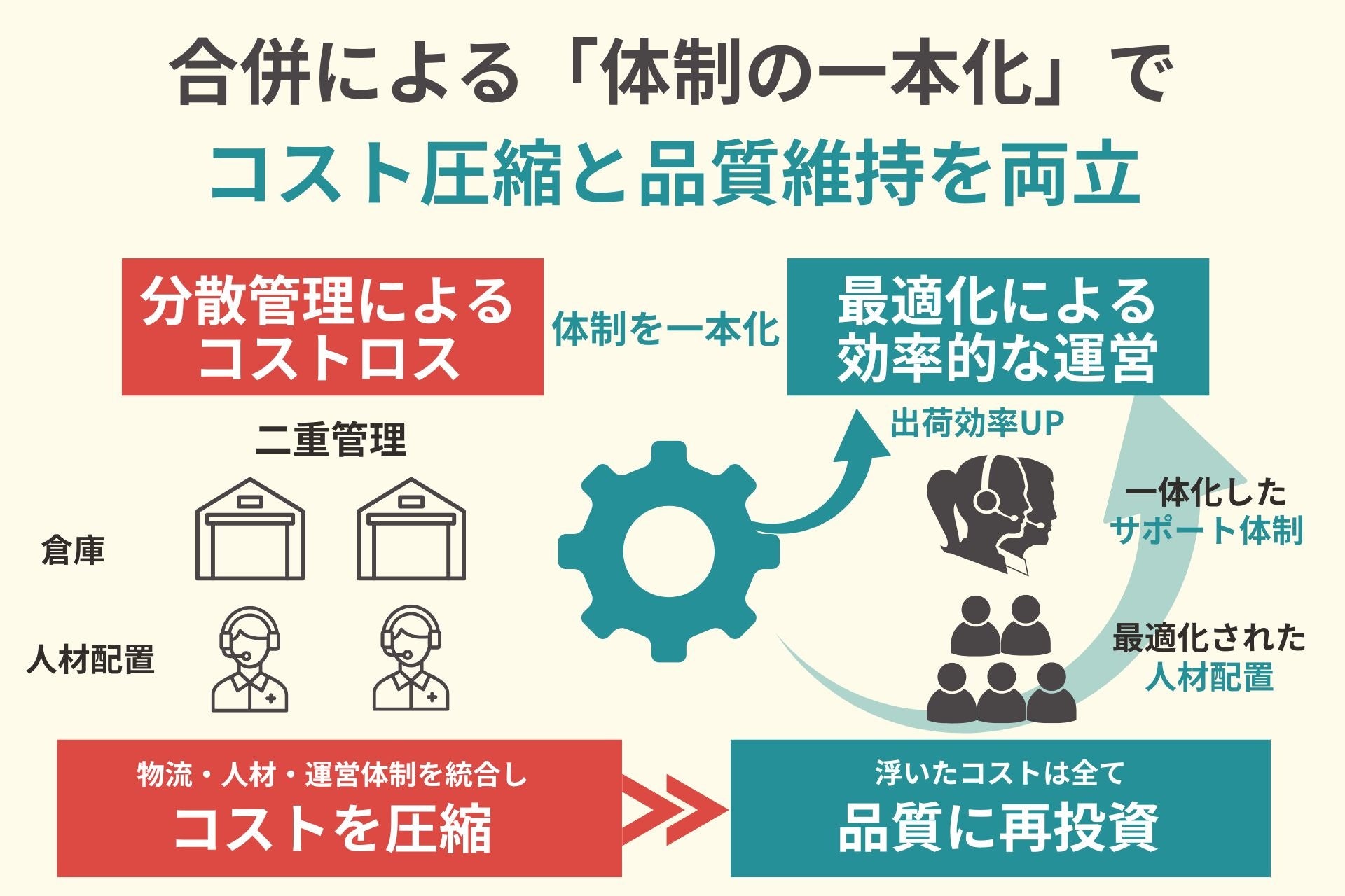 合併を契機に、物流拠点やカスタマー対応体制を一本化し、在庫管理や出荷業務の重複を解消。さらに、マーケティング・製造・サポートスタッフの最適配置を行うことで、無駄な人件費や固定費の圧縮に成功しました。