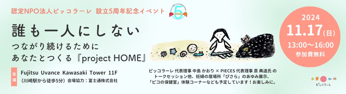本講座の中でもお伝えする「ピコの保健室」や「ぴこカフェ」などproject HOME(居場所事業)をテーマにしたピッコラーレ5周年記念イベント「誰も一人にしない〜 つながり続けるために あなたとつくる『project HOME』〜」を11月17日(日)に開催します。