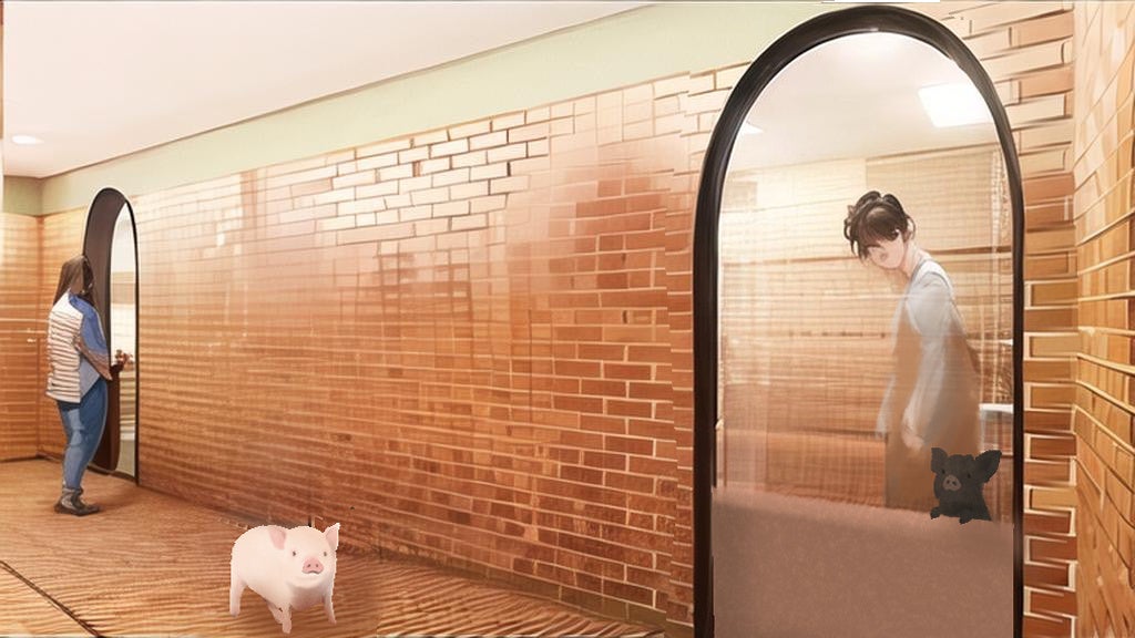 内装は童話「三匹のこぶた」をモチーフに、床から天井にかけて「レンガ・木・藁」の三つの要素を取り入れたデザイン。店内は「フロア・個室・屋上」の3つのエリアに分かれており、ゆったりくつろげるフロアやpigちゃんとのプライベート空間を楽しめる個室だけでなく、開放感あふれる屋上エリアではおやつあげ体験などのアクティビティが楽しめます。