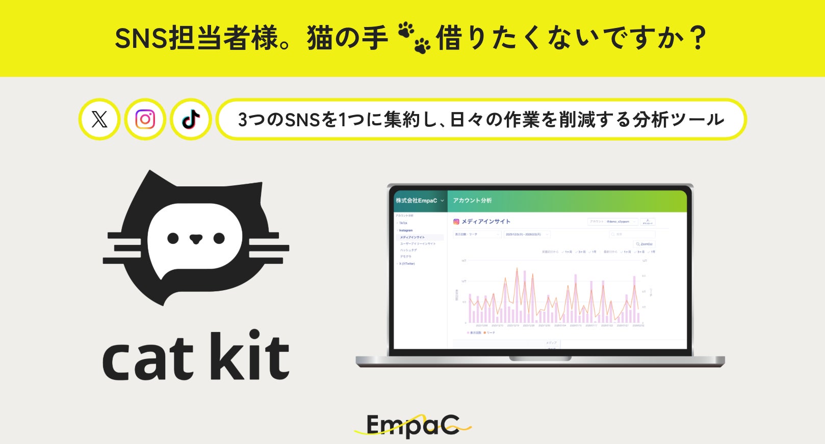 株式会社EmpaC(東京都品川区五反田 代表取締役 松山真衣)は、3つのSNSを1つに集約し、日々の作業を削減する分析ツール「cat kit」を2月22日より提供開始いたします。