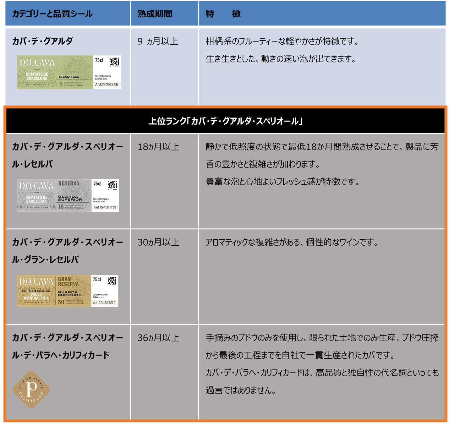 瓶内熟成期間によって、カバ・デ・グアルダ(熟成期間が最低9ヶ月)とカバ・デ・グアルダ・スペリオール(熟成期間がより長い上に、樹齢10年以上の特定の畑のヴィンテージ・カバから造られ、2025年から100%オーガニック生産)が存在します。スペリオールは、瓶内熟成期間によって3つのカテゴリーに分けられており、18ヶ月熟成のレセルバ、30ヶ月熟成のグラン・レセルバ、36ヶ月熟成のパラヘ・カリフィカード)があります。