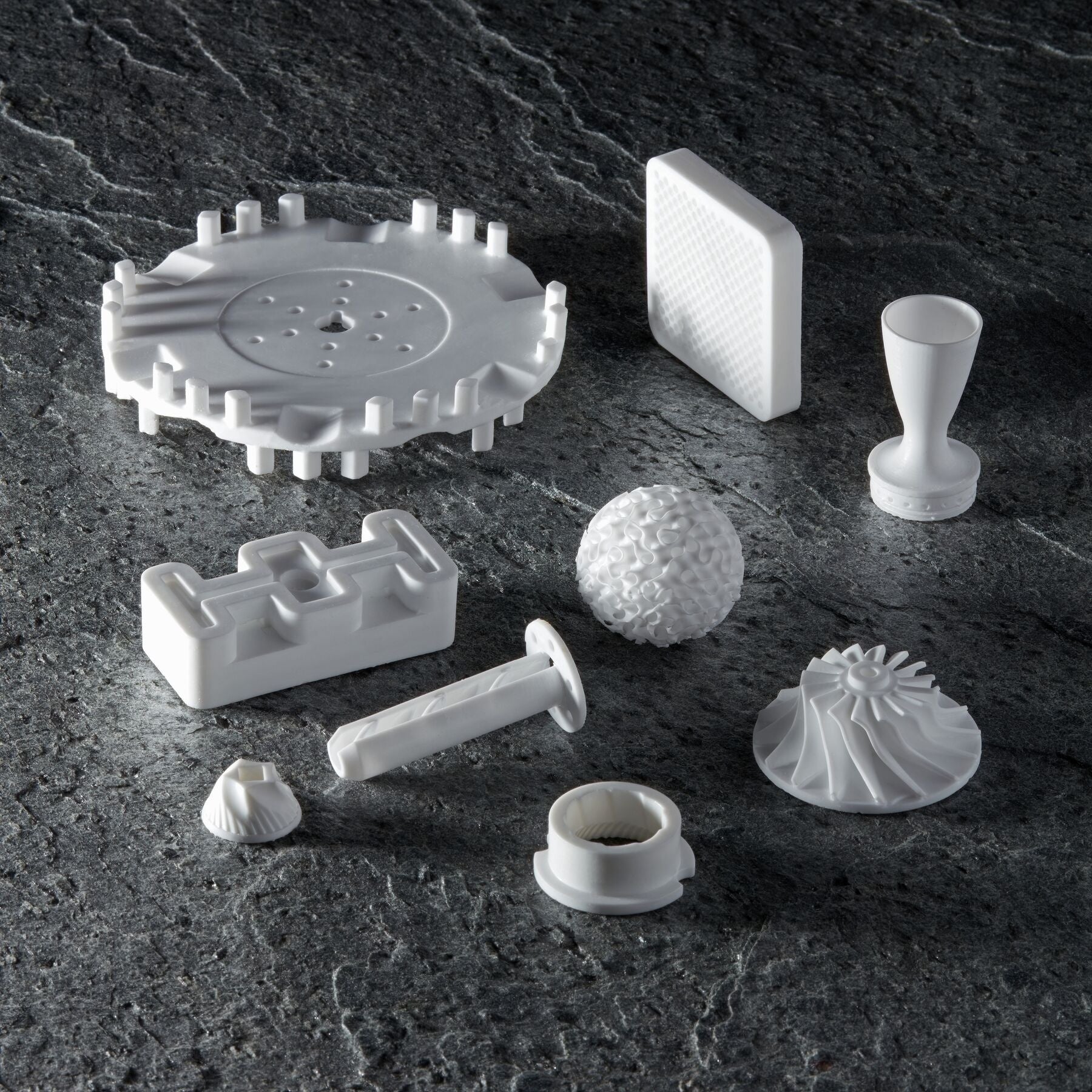 Alumina 4Nレジンのサンプル。電気電子、自動車やモビリティ、航空宇宙、防衛、化学分野などで 過酷な環境に耐える必要のあるセラミック部品を従来工法よりも低コストかつ短期間で製作できる。