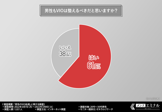 そこで、「男性もVIOは整えるべきだと思いますか?」と質問したところ、6割以上の方が『はい(61.6%)』と回答しました。