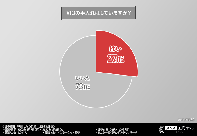 そこで、「VIOの手入れはしていますか?」と質問したところ、2割強の方が『はい(27.0%)』と回答しました。