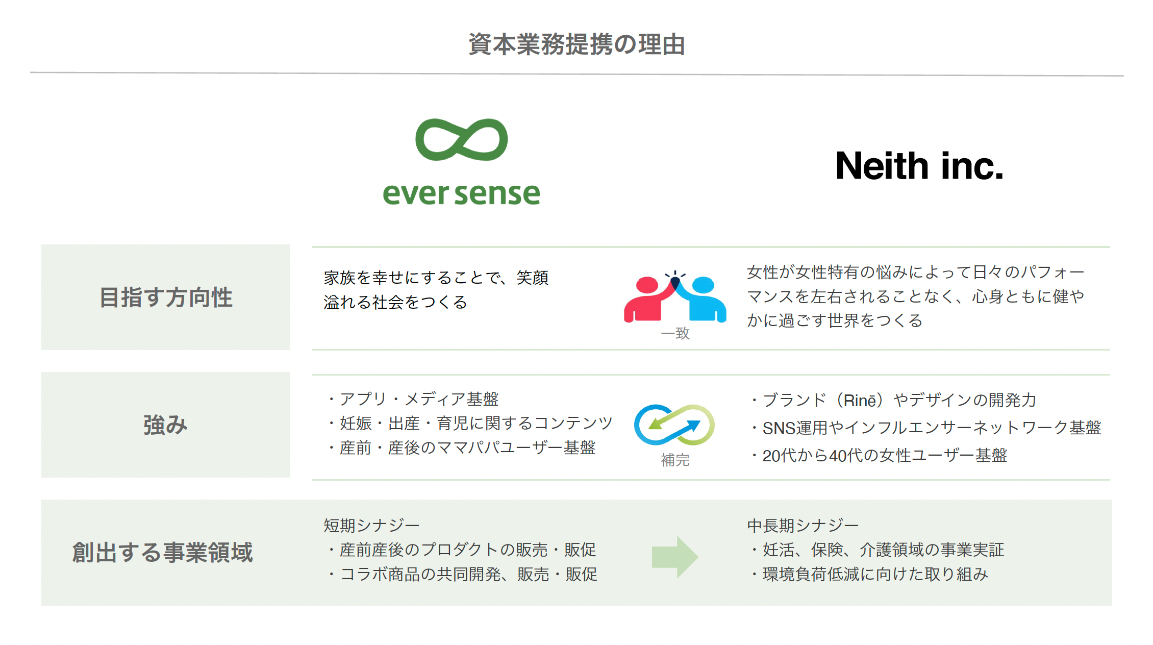 「女性が心身ともに健やかに過ごすサポートをしたい、という信近さんの強い思いがプロダクトにも表れており、細部までのこだわりを実現したものづくりは、多くの方の課題を解決すると確信しています。私たちエバーセンスも、家族を軸に妊活・妊娠・出産・育児期の女性ユーザー向けのプロダクトを、日々改善しながらつくってきました。これまでの知見を活かし、この度資本業務提携という形で新しいプロダクトを共創していけることを楽しみにしています。Neithさんの事業成長を共にチャレンジしながら加速させていくとともに、多くの女性が健やかな毎日を送れる社会の実現に向けて、尽力してまいります。」