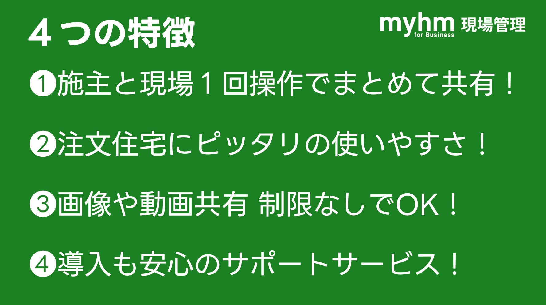 昨今、様々な建築規模に対応すべく、多機能、複雑化された現場管理サービスが増えています。「マイホムビズ現場管理」は住宅の建築現場に特化し、必要とされる機能のみにサービスを絞り、家づくりの現場に最適機な現場管理を提供しています。