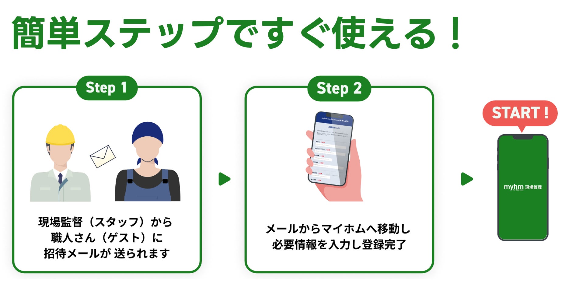 「マイホムビズ現場管理」は招待メールからすぐに使えます。専用アプリをインストールしなくてもスマホで現場管理が使えます。