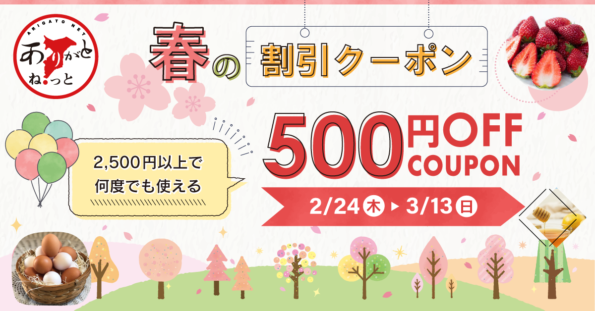株式会社ジェス(本社:千葉県成田市 社長:長谷川 直行)は、千葉県の産業復興を支援するモール型ECサイト「ありがとねっと」にて、2022年2月24日(木)~3月13日(日)の期間限定で、「春の割引クーポン」をプレゼントいたします。今回のクーポンは、ありがとねっと掲載商品のすべてが対象となり、税込2,500円(送料別)以上のご購入の際に500円割引となります。また、クーポン利用回数に制限はなく、期間内であれば何度でもご利用いただけます。