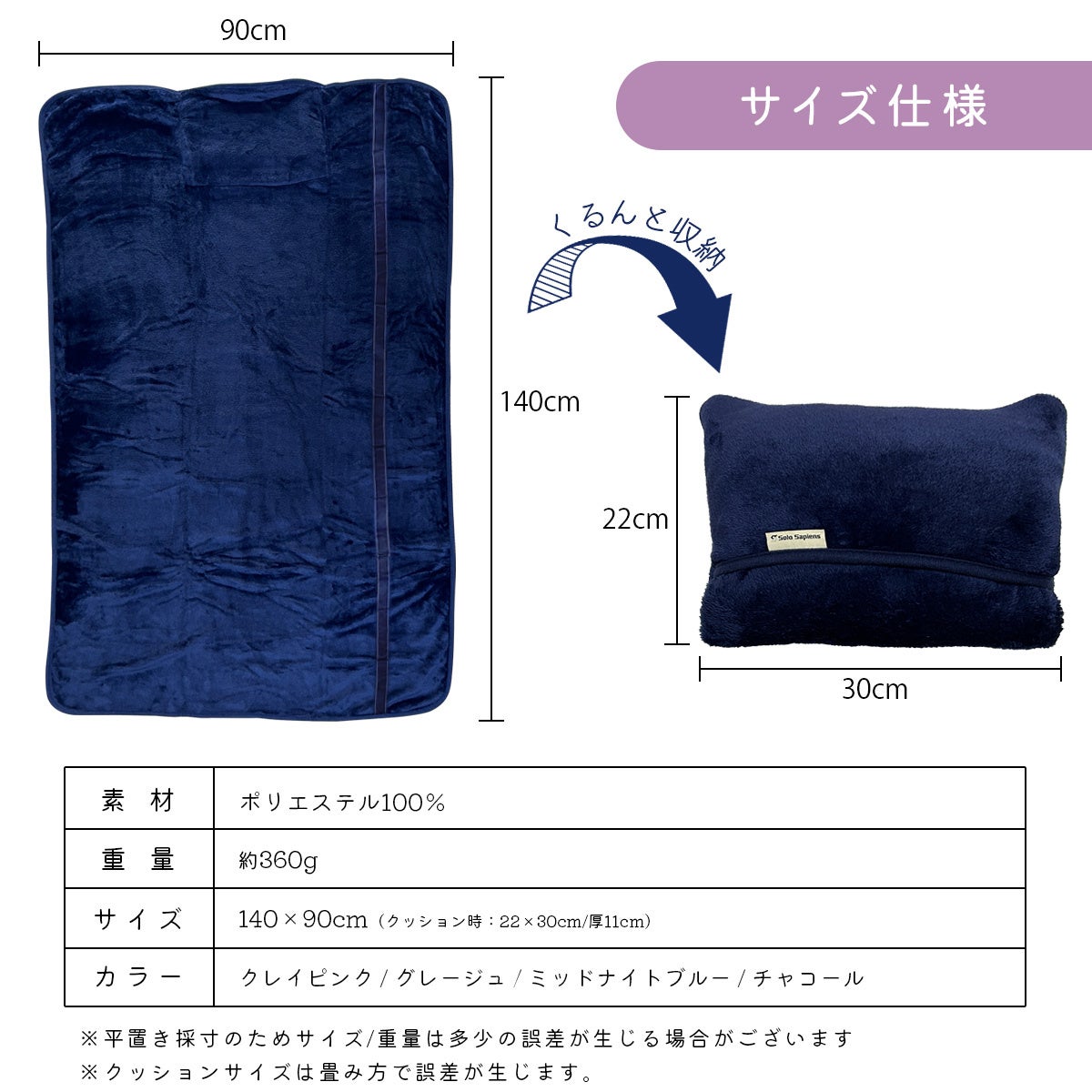 サイズ:140cm×90cm(クッション時:22cm×30cm)/重量:約360g/素材:ポリエステル100% ※圧縮袋に入れて出荷されるため、開封直後はぺったんこですので、本来の風合いに戻るまで少々時間がかかります。また、起毛素材の特性上、ケバや糸くずが発生しやすいので、最初のご使用前に洗濯するようお願いいたします。