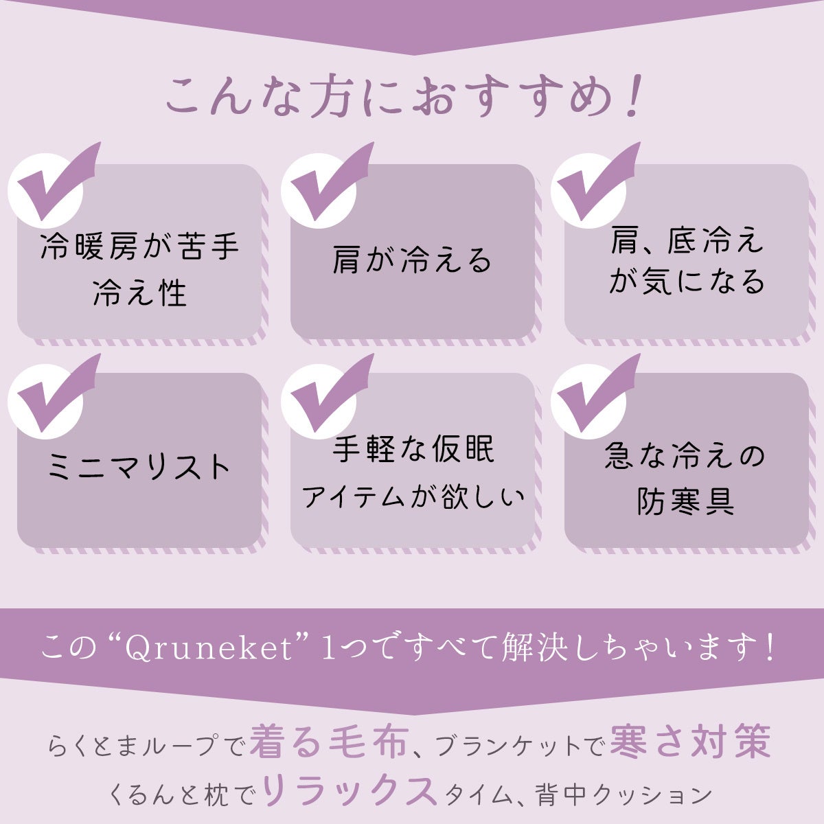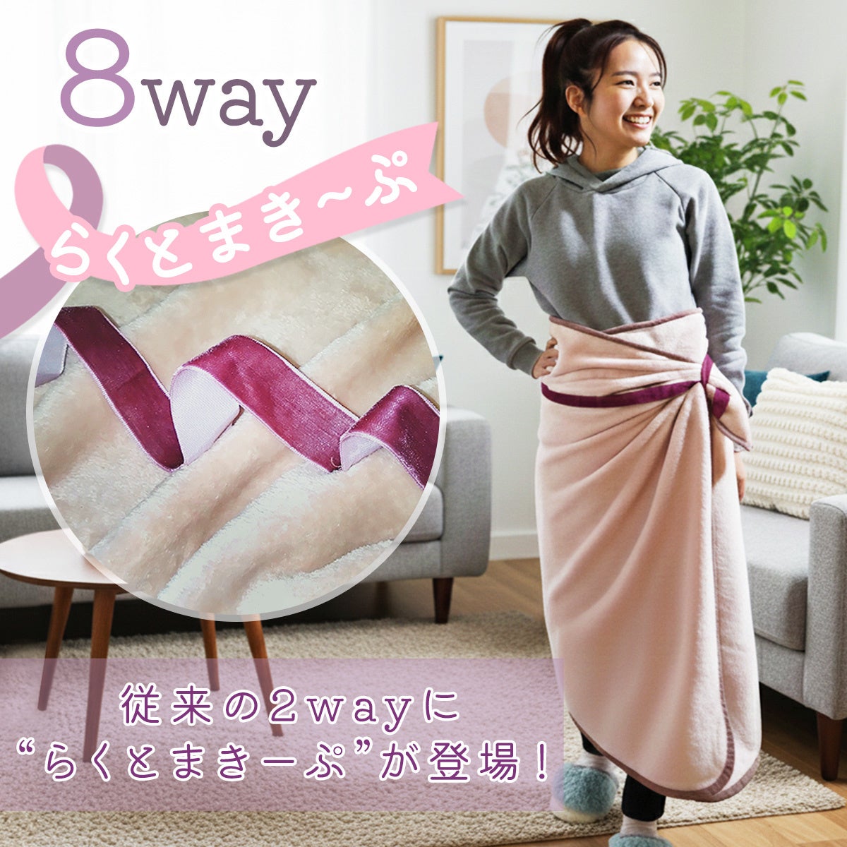 ボタンなしでズレ落ちを解消する新機能「らくとまきーぷ」を搭載。くるんと丸めればクッションに変わる設計で、家事やデスクワーク、キャンプでも極上のぬくもりを纏ったまま、ストレスなく自由に動けます。