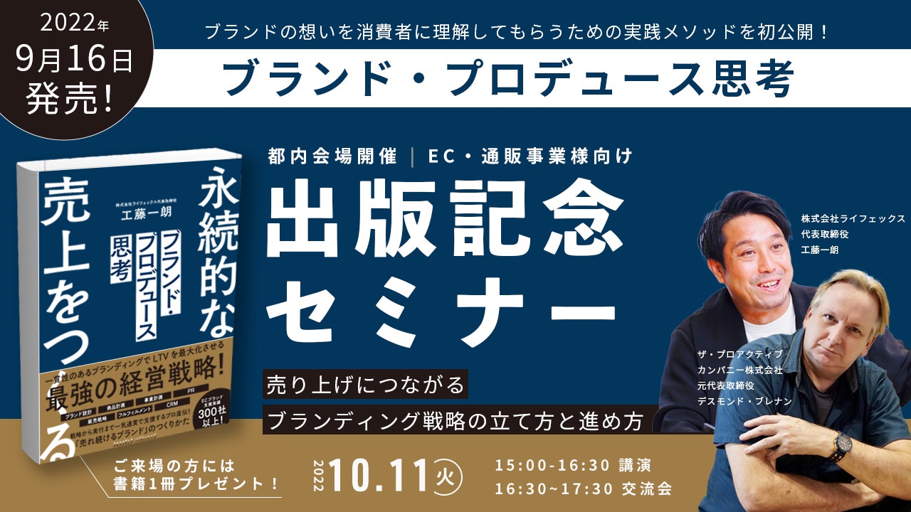 EC・通販企業を中心に新規獲得、リピート顧客育成の支援を行うマーケティングプロデュースカンパニー、株式会社ライフェックス(所在地:東京都千代田区、代表取締役:工藤一朗 以下当社)は、2022年10月11日(火)に書籍『ブランド・プロデュース思考』の発売を記念し、出版記念セミナー・交流会を開催いたします。