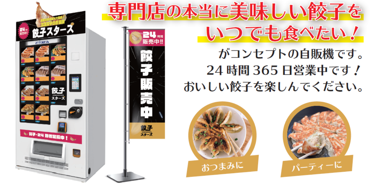 無人餃子販売の完成形!全国各地の有名店、特産品を使った餃子が24時間買える冷凍自販機「餃子スターズ」の開発・販売を開始しました。