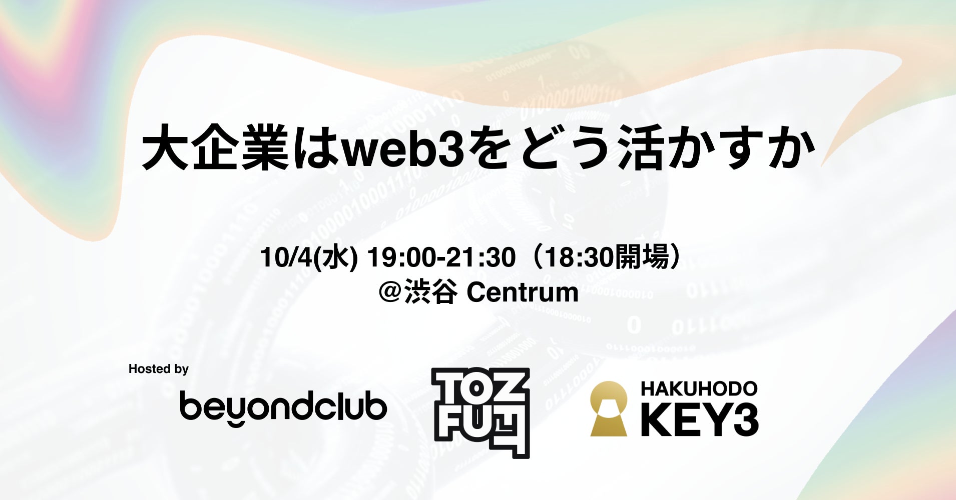この提携に併せて、10月4日に渋谷Centrumにて「ブランド・大企業はNFTやweb3をどう活用するべきか」というイベントをtofuNFT、博報堂キースリーと共同開催いたします。