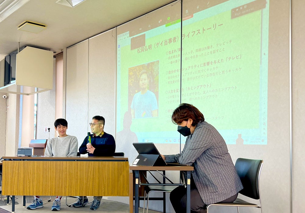 今回の研修においては、SDGs「5.ジェンダー平等を実現しよう」の取り組みの一環とし、野口代表をはじめ、当事者であるドキュメンタリー映画製作者の松岡弘明さんや元女子サッカー選手のメイミーさんをゲストにお招きいたしました。100名を超える職員が参加を希望し、松岡さんとメイミーさんの個人的な体験やライフストリーを共有することから始まりました。お2人は「LGBTQ+の当事者」という枠にとらわれるのではなく、「一人の人間」として理解してほしい、向き合ってほしい、知ってほしい。と語られていました。率直な話は、参加者であるGLOBALTREEGROUPの職員にとって大きな示唆を与えるものでした。真剣に耳を傾け、時には頷き、グループディスカッションでは積極的に意見を交換し、その内容を踏まえて質疑応答を行いました。性の多様性やジェンダーに関する理解をより深める有意義な時間となりました。