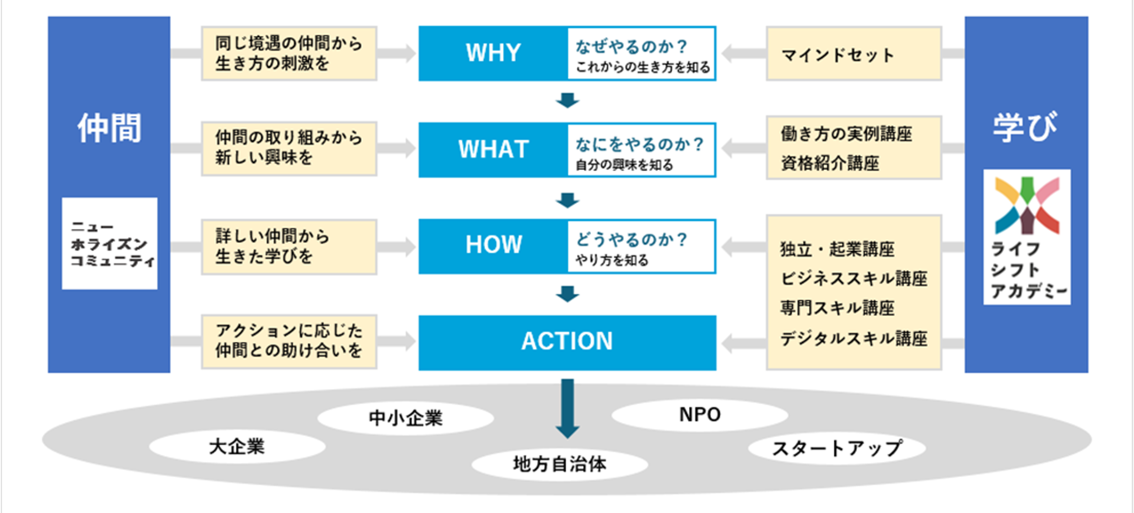 企業に在籍中の方も、今の仕事を大切にしながら、企業の支援をうけることで、このLSPプログラムを通じ「仲間」と「学び」を得て、新たなチャレンジをイメージできると考えます。