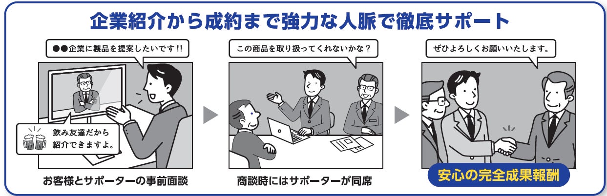 「希望する企業名に繋がりのある人脈者からピンポイントで紹介営業」と「圧倒的な企業数からニーズに合致した企業の紹介営業」の強力な営業支援により新規顧客の開拓を徹底サポートして参ります。