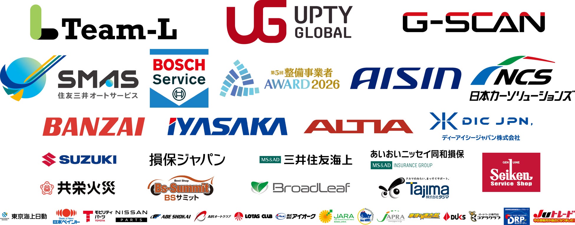 株式会社インターサポート/株式会社チームエル/株式会社アプティグローバル/住友三井オートサービス株式会社/日本カーソリューションズ株式会社/ボッシュカーサ―ビス/株式会社アイシン/株式会社バンザイ/株式会社イヤサカ/株式会社アルティア/ディーアイシージャパン株式会社/スズキ株式会社/BSサミット事業協同組合/株式会社ブロードリーフ/株式会社タジマ/明治産業株式会社/損害保険ジャパン株式会社/あいおいニッセイ同和損害保険株式会社/三井住友海上火災保険株式会社/共栄火災海上保険株式会社/東京海上日動火災保険株式会社/株式会社オリコオートリース/ダックス株式会社/株式会社ジャプラ/トヨタモビリティパーツ株式会社/日産自動車株式会社/日本ペイント株式会社/株式会社速太郎本部/株式会社阿部商会/AIRオートクラブ/全日本ロータス同友会/株式会社アイオーク/株式会社JARA/株式会社ビッグウェーブ/DRPネットワーク株式会社/株式会社JUコーポレーション(順不同)