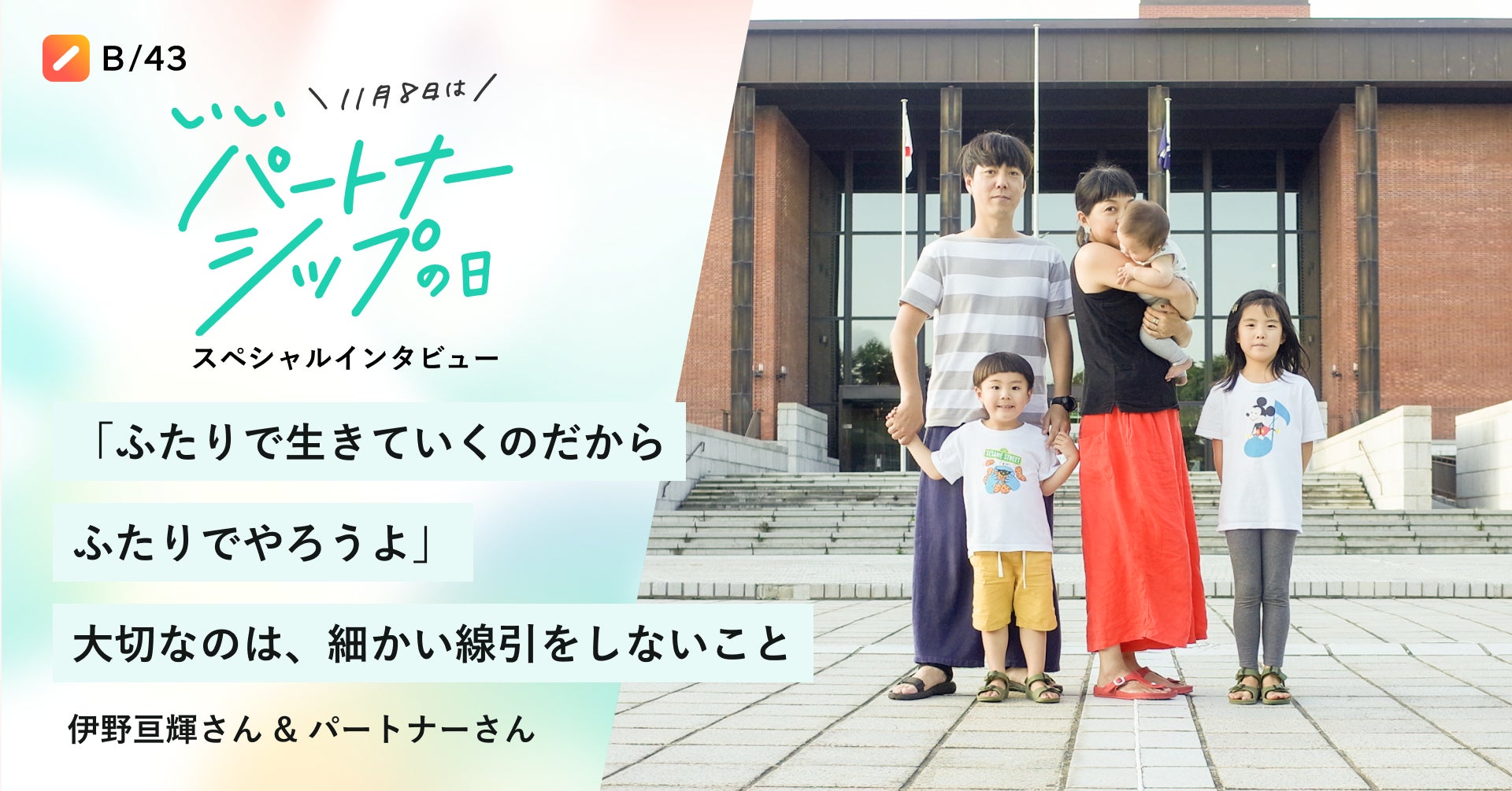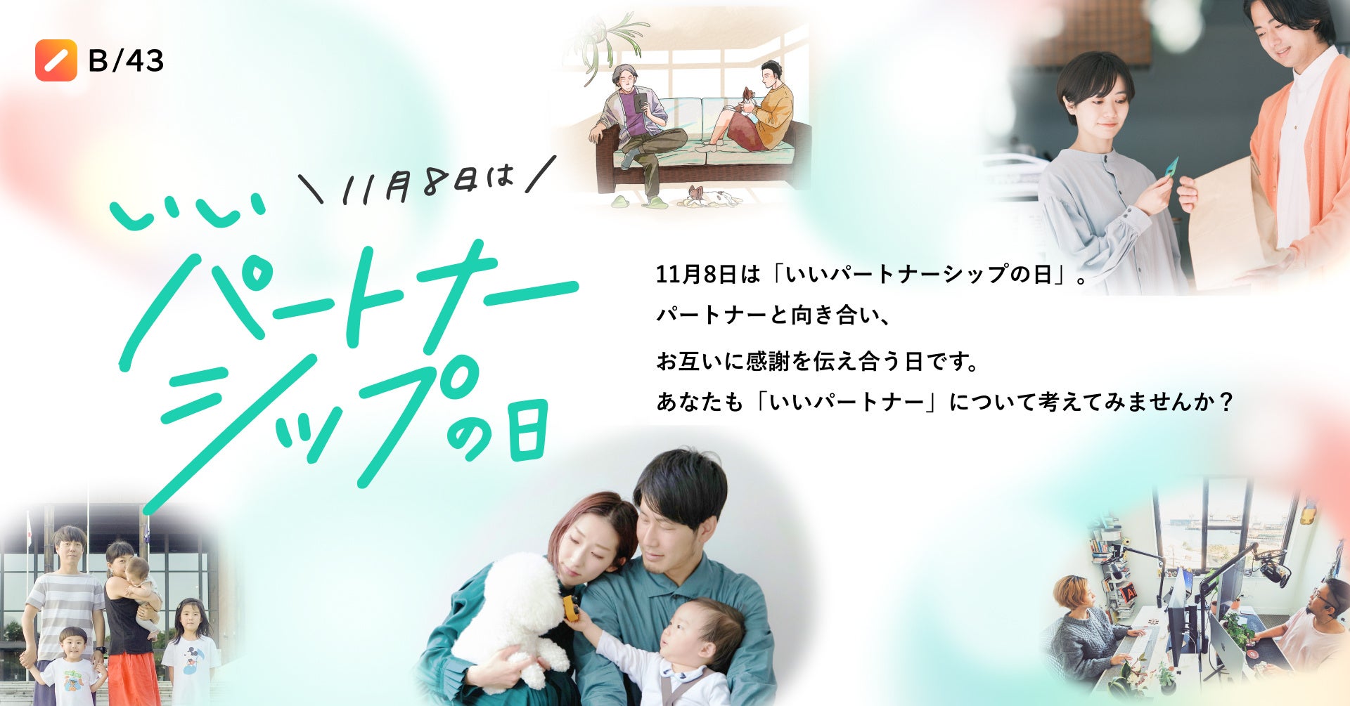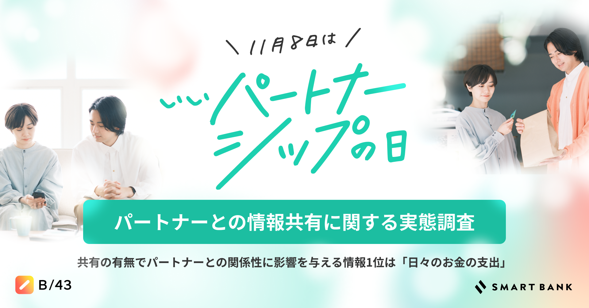 家計簿プリカ「B/43(ビーヨンサン)」を提供する株式会社スマートバンク(本社:東京都品川区、代表取締役:堀井 翔太、以下「当社」)は、11月8日「いいパートナーシップの日」に合わせ、特設ページを公開し、「いいパートナー」をテーマにしたインタビュー記事を公開しました。合わせて、パートナーとの豊かな時間を過ごしていただくためのSNSプレゼントキャンペーンも実施いたします。