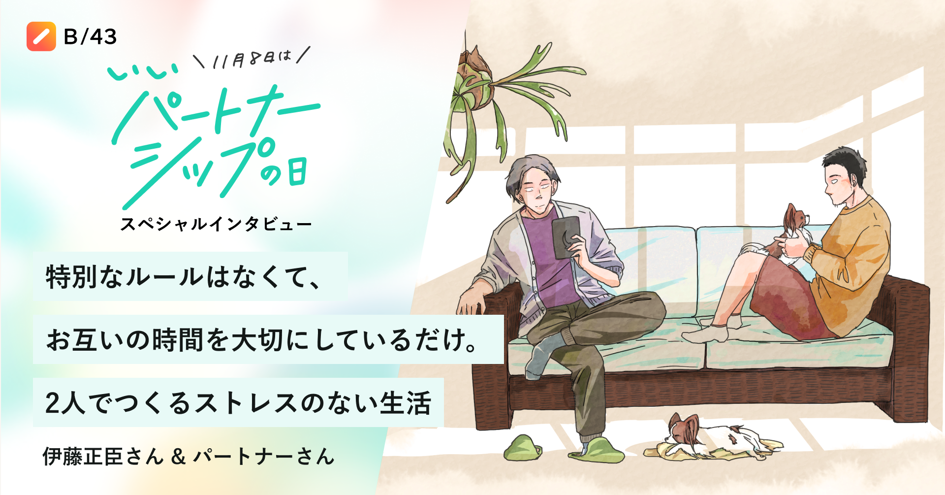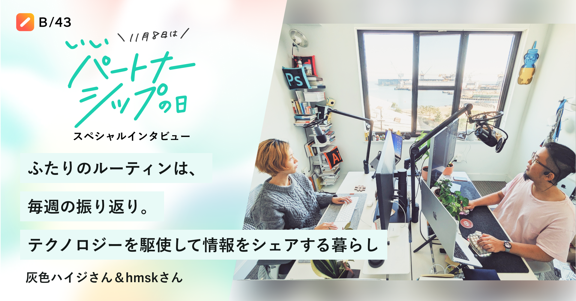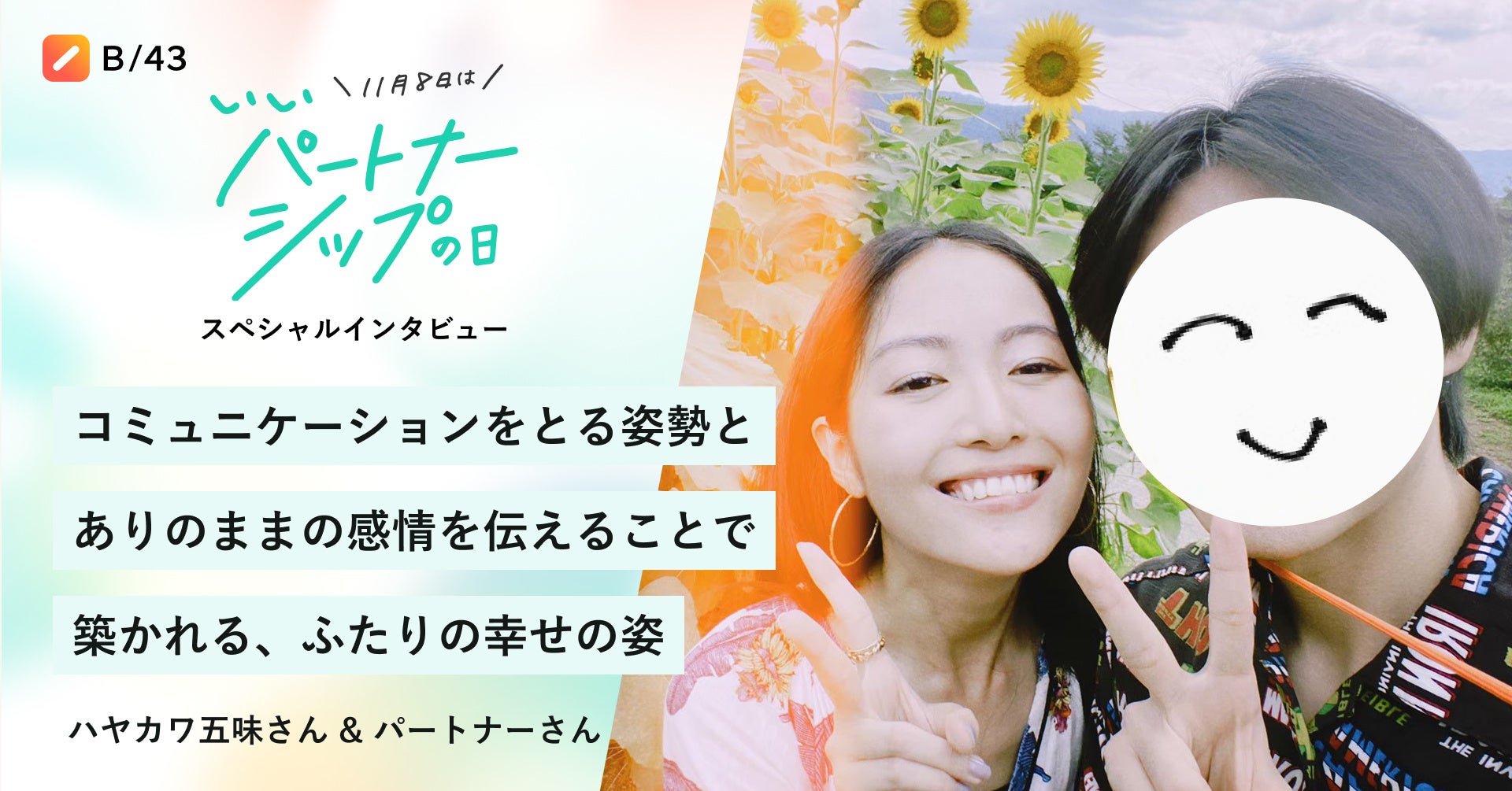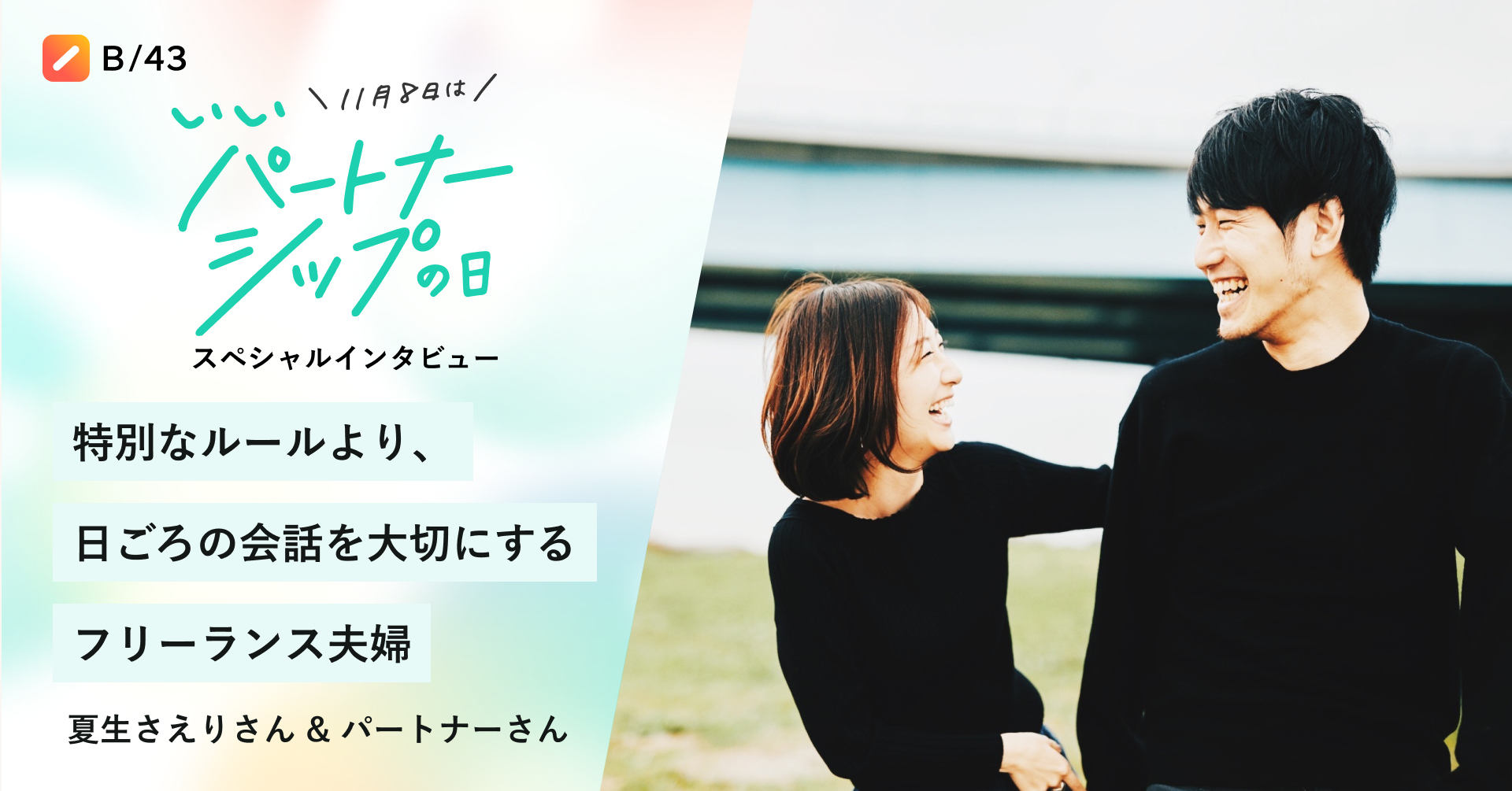 家計簿プリカ「B/43(ビーヨンサン)」を提供する株式会社スマートバンク(本社:東京都品川区、代表取締役:堀井 翔太、以下「当社」)は、11月8日「いいパートナーシップの日」に合わせ、特設ページを公開し、「いいパートナー」をテーマにしたインタビュー記事を公開しました。合わせて、パートナーとの豊かな時間を過ごしていただくためのSNSプレゼントキャンペーンも実施いたします。