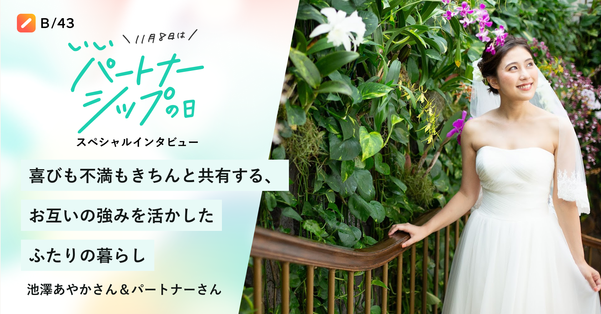 当社は、パートナーと家計を共同で管理できる「B/43ペアカード」を提供しています。日頃、多くのペアの方々にご利用いただいていることから、パートナーシップについて考えるコンテンツを配信したいと考えました。