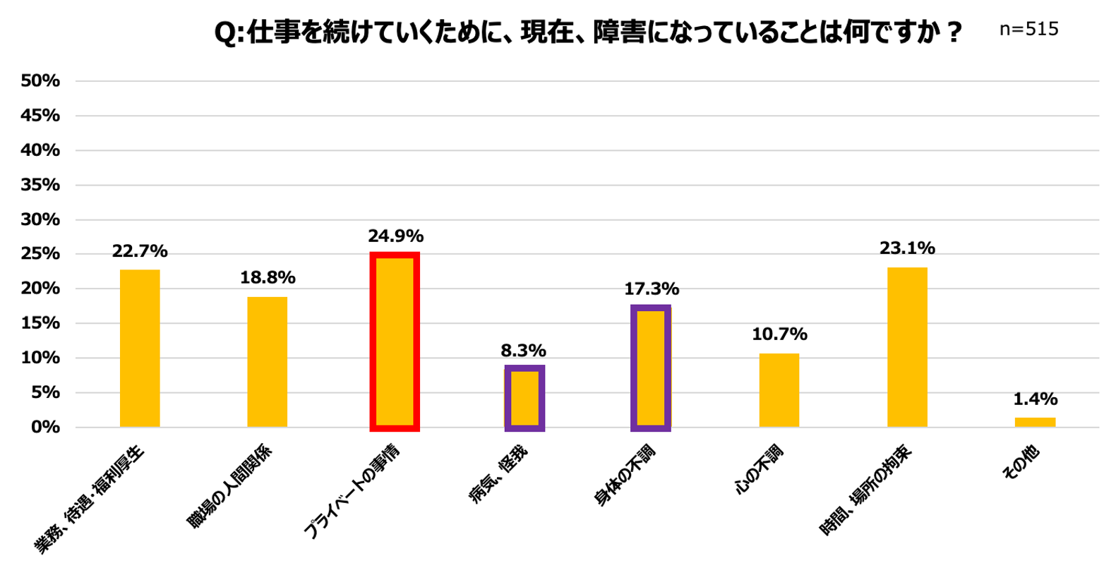 現在、仕事を続けていくために障害になっていることの第1位は「プライベートの事情」(24.9%)、第2位は「時間、場所の拘束」(23.1%)、第3位は「業務、待遇・福利厚生」(22.7%)。