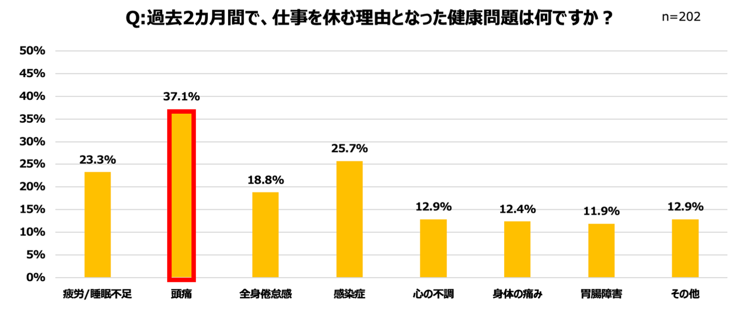 仕事を休む理由となった健康問題の第1位は「頭痛」(37.1%)、第2位は「感染症」(25.7%)、第3位は「疲労/睡眠不足」(23.3%)。疲労/頭痛、睡眠不足など「未病領域」が原因で、仕事を休むことが多い結果に。(※過去2カ月間で健康問題が理由で仕事を休んだ経験がある女性に質問)