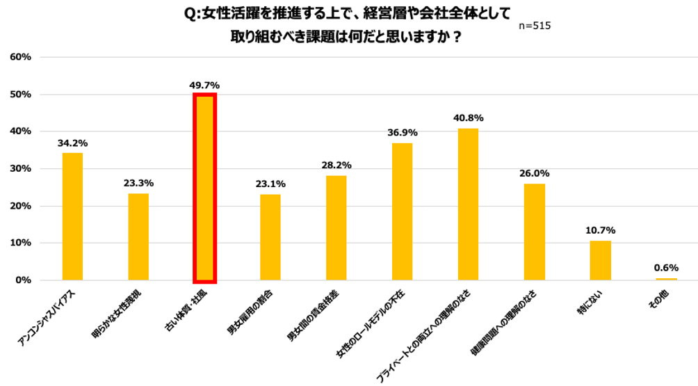 女性が思う女性活躍推進を妨げている課題の第1位は「古い体質・社風」(49.7%)、第2位は「プライベートとの両立への理解のなさ」(40.8%)、第3位は「女性のロールモデルの不在」(36.9%)。一方で、「健康問題への理解のなさ」(26.0%)は、上位3項目と比べると低いものの、4人に1人が組織として取り組むべき課題と認識。